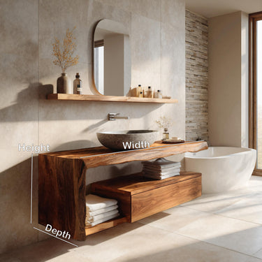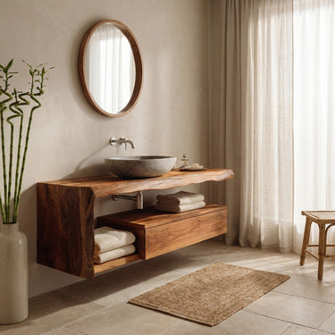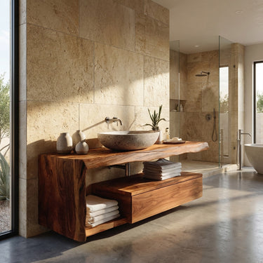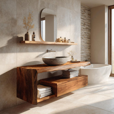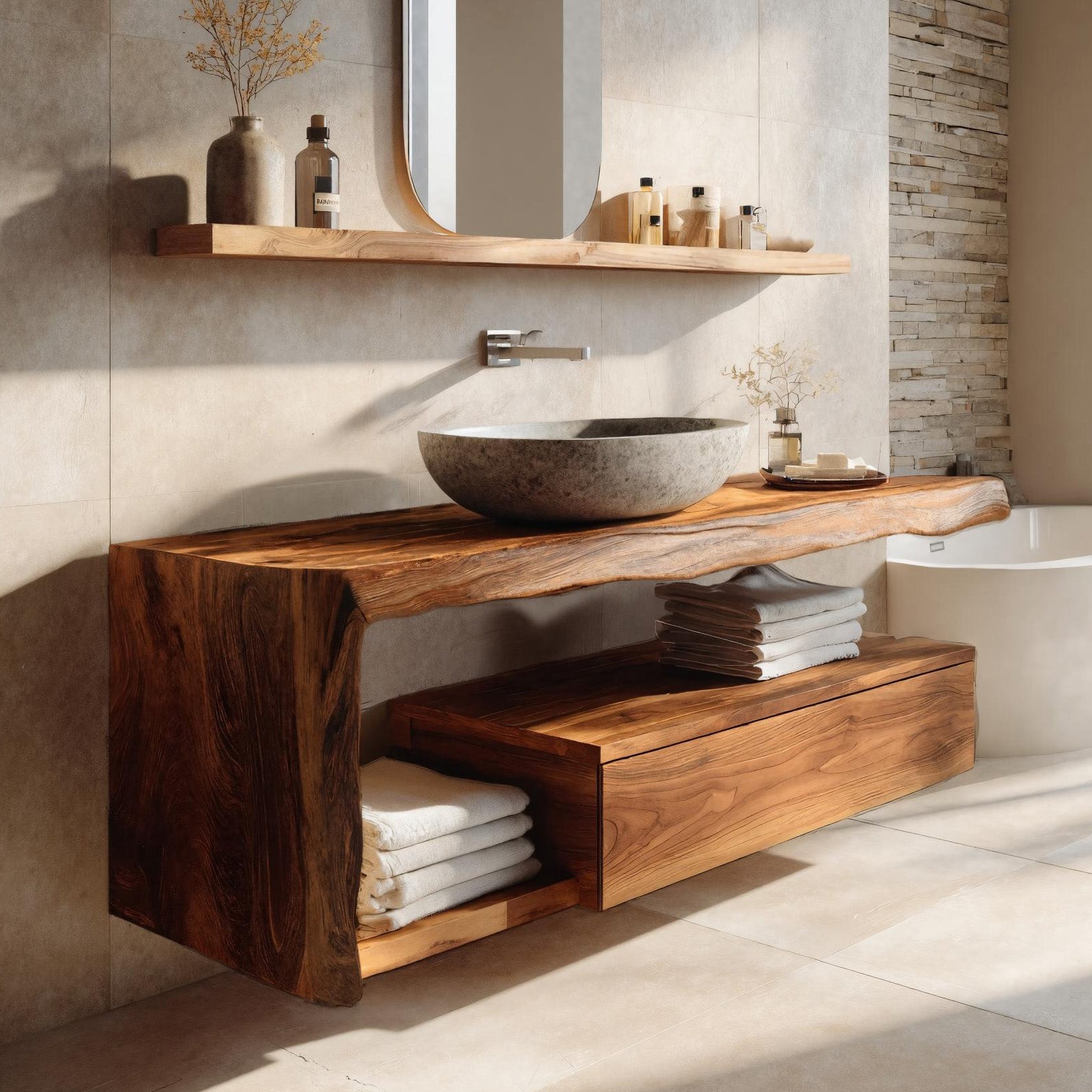 Sculpted natural wood form frames Modern Floating Bathroom Vanity For Spa, creating a warm and tranquil centerpiece that enhances the atmosphere of a relaxing bathing space. The flowing live-edge silhouette highlights the organic character of the wood, while the floating structure keeps the room visually light and open. Its natural contours and rich grain patterns introduce texture and calm visual balance, complementing the surrounding stone and minimalist fixtures.