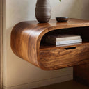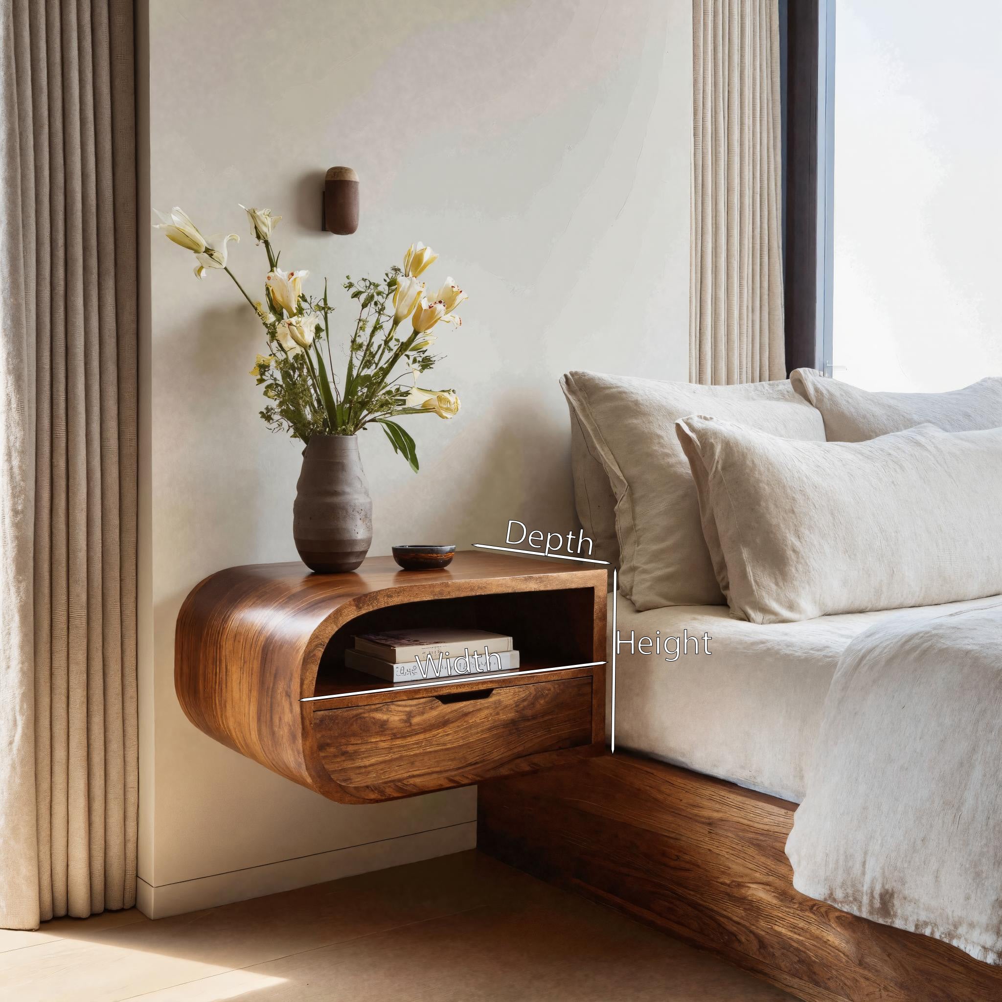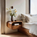 Softly rounded geometry introduces a calm visual flow through Minimalist Floating Nightstand With Storage For Bedroom, allowing the piece to hover quietly beside the bed while maintaining a sense of balance and continuity. The gently curved outer shell wraps around an open storage compartment and integrated drawer, with natural wood grain moving seamlessly across the surface. Its floating form brings warmth and subtle depth without interrupting the surrounding space.