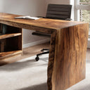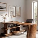 - Functional Benefits: The L-shaped layout offers generous working space for multitasking, reading, or creative projects, while the open bookshelf provides easy access to books, files, and décor. Live edge detailing emphasizes the organic character of the wood, adding visual interest without compromising practicality.