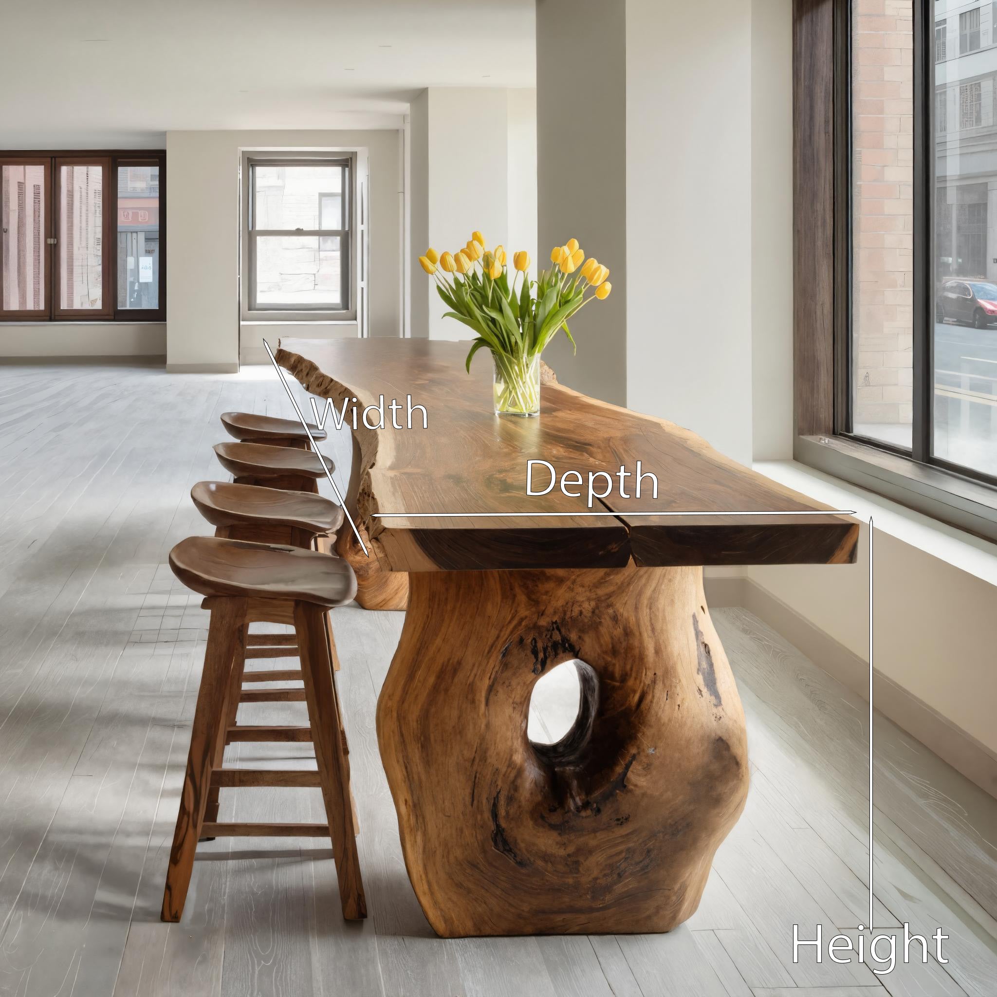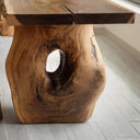 - Materials & Craftsmanship: Made from solid natural wood with expressive, flowing grain, the live-edge top is expertly shaped to maintain its organic contours while achieving a balanced, refined silhouette. The handcrafted base—carved from a substantial trunk form—features natural voids and textures that make every piece truly one of a kind. Skilled artisans sand and finish each surface by hand, using eco-friendly protective oils that enhance the wood’s natural warmth and provide long-lasting durability. Strong joinery techniques ensure a stable structure built to last for generations.