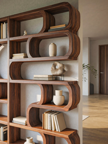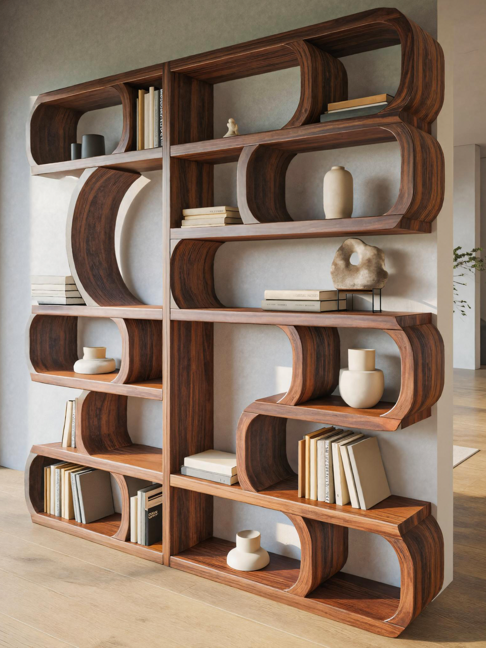 Elevate your space with our Modern Sculptural Bookshelf With Symmetrical Curves For Living Room Or Office is designed to elevate storage into a refined design statement. The rhythmic curved form creates visual harmony while adding depth and movement to the surrounding space.