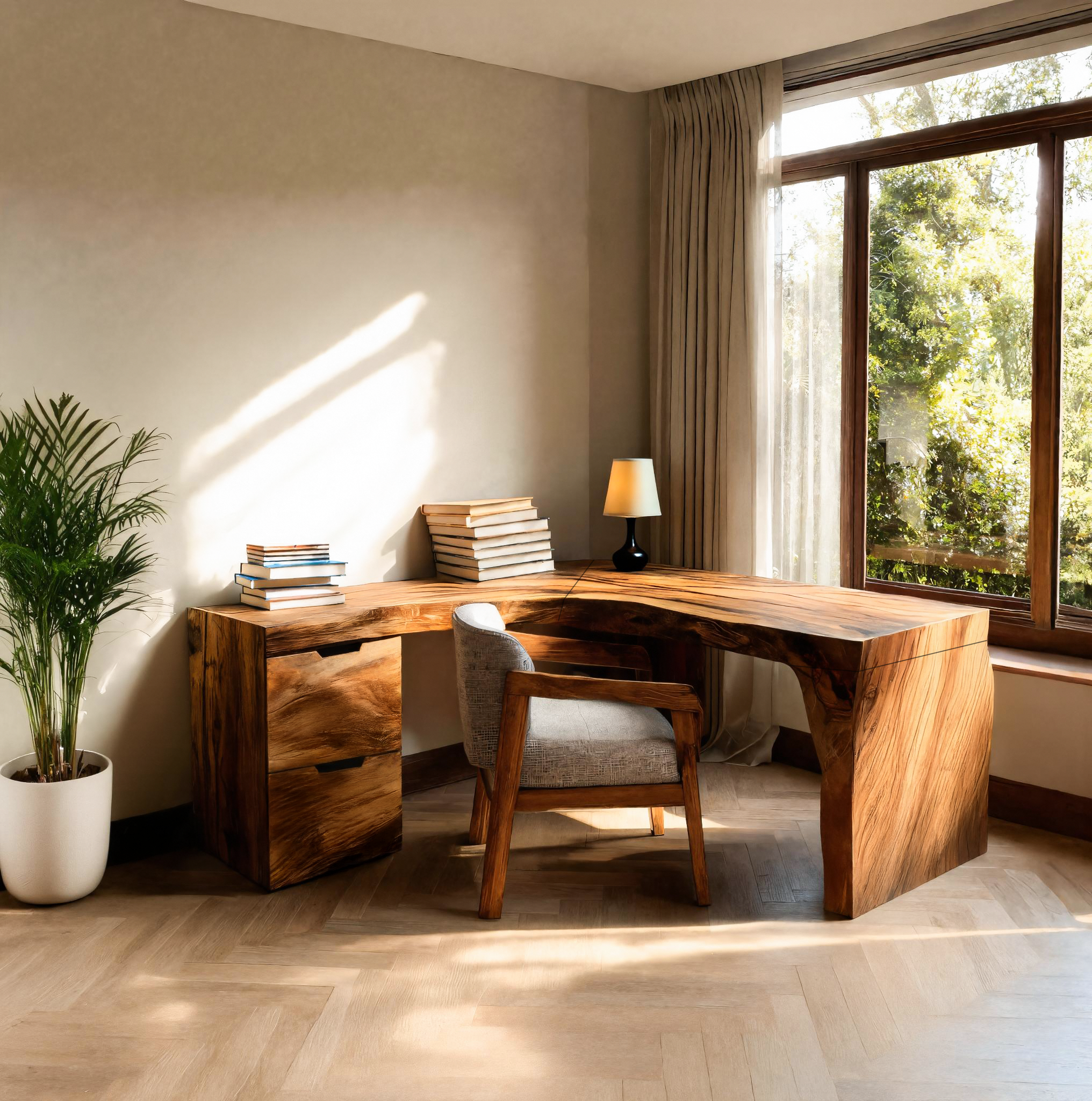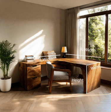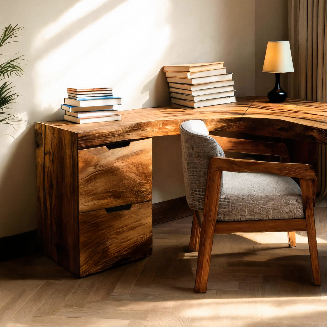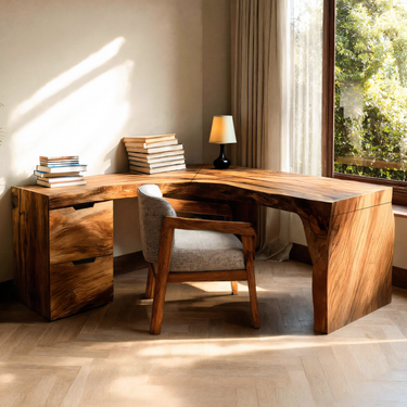 The Rustic L Shaped Corner Desk For Home Office is designed to bring natural warmth and practical comfort into your workspace. Its seamless L-shaped layout offers a generous work surface for multitasking, while the built-in drawer unit keeps daily essentials neatly organized. Soft rounded edges and a smooth hand-finished surface create a pleasant working environment, and the solid, weighty construction ensures long-term stability. Each desk features unique natural wood grain patterns, giving your home office a piece that feels warm, grounded, and truly one-of-a-kind.