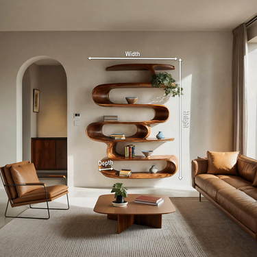 Sculptural movement and flowing contours define the presence of the Elegant Wall-Mounted Bookshelf For Modern Home Decor, transforming vertical space into a functional design statement. The continuous, organic form creates a rhythmic visual flow across the wall, while open sections invite light and air to move freely around displayed objects. Natural wood grain follows the curves of the structure, adding warmth and depth that softens modern interiors.