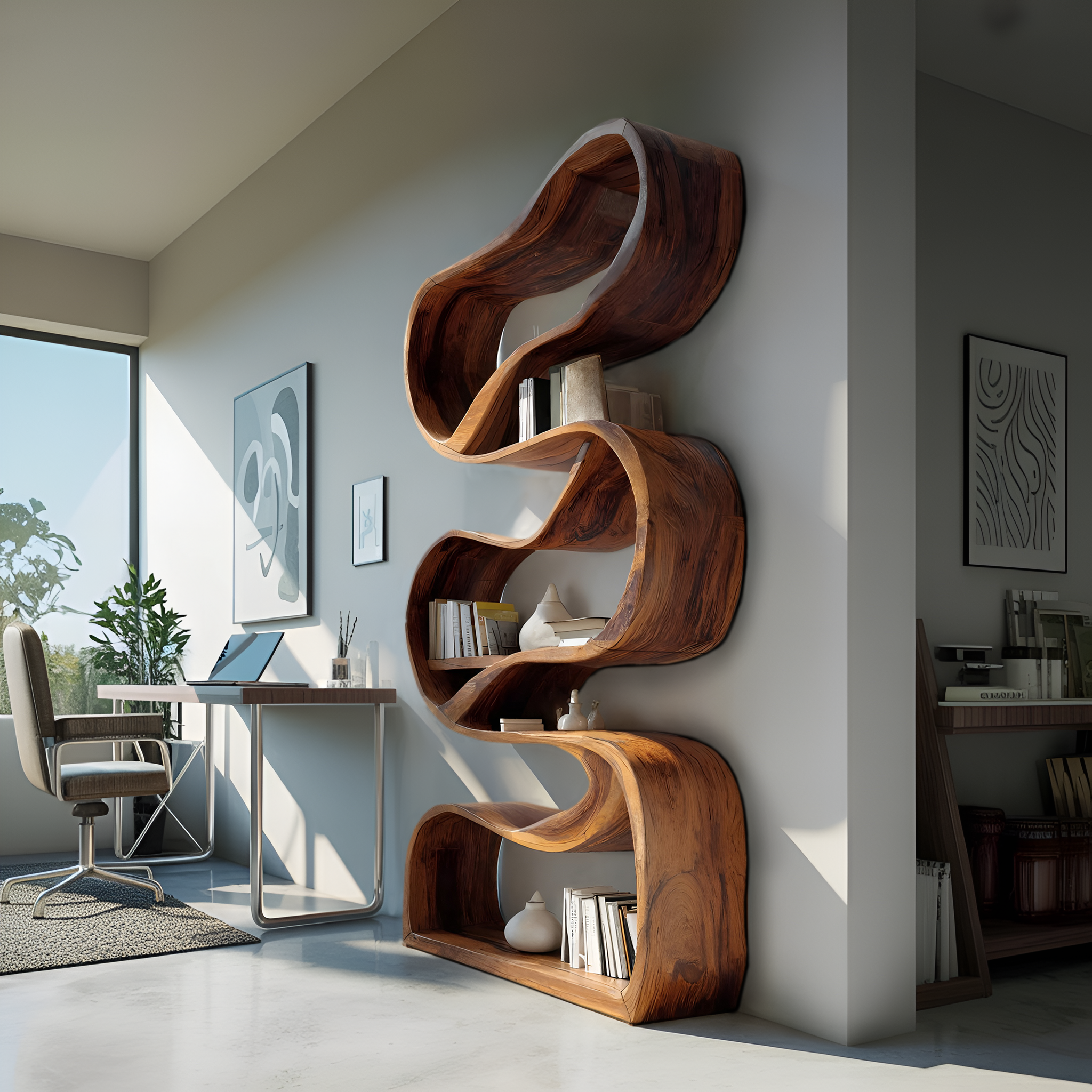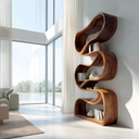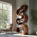 Bold curvature and vertical articulation shape the Modern Sculptural Bookcase Statement Design For Hallway, presenting storage as a fluid form that interacts with light and space. The bookcase rises in a sequence of carved recesses, each shelf unfolding from a continuous wooden ribbon that guides the eye upward. Its sculptural profile creates visual interest along the wall while allowing books and objects to appear naturally framed within the flowing structure.