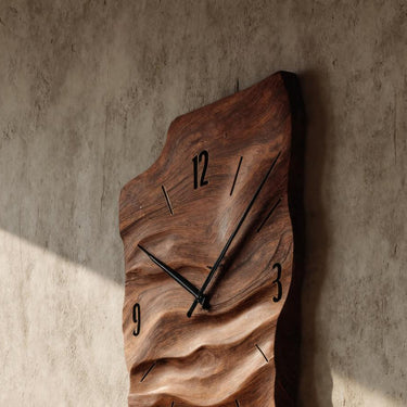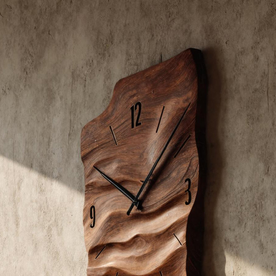 A flowing carved surface defines this Modern Wall Clock Carved Design For Living Room Space, where time is presented through sculptural depth rather than a flat face. The elongated form follows gentle undulations in the wood, allowing natural grain patterns to move organically across the clock body. Subtle relief carving introduces shadow and dimension, giving the piece a quiet presence that evolves with changing light throughout the day.