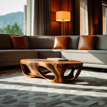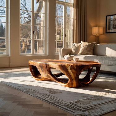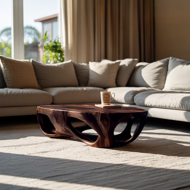Sculpted through negative space and flowing contours, Artistic Coffee Table Carved Hollow Design For Lounge Space brings a striking yet balanced presence to relaxed seating areas. The carved hollow form creates visual depth beneath the tabletop, allowing light and shadow to interact naturally with the wood’s expressive grain. Its low, grounded profile encourages an open atmosphere, turning the table into both a functional surface and a sculptural focal point within the room.