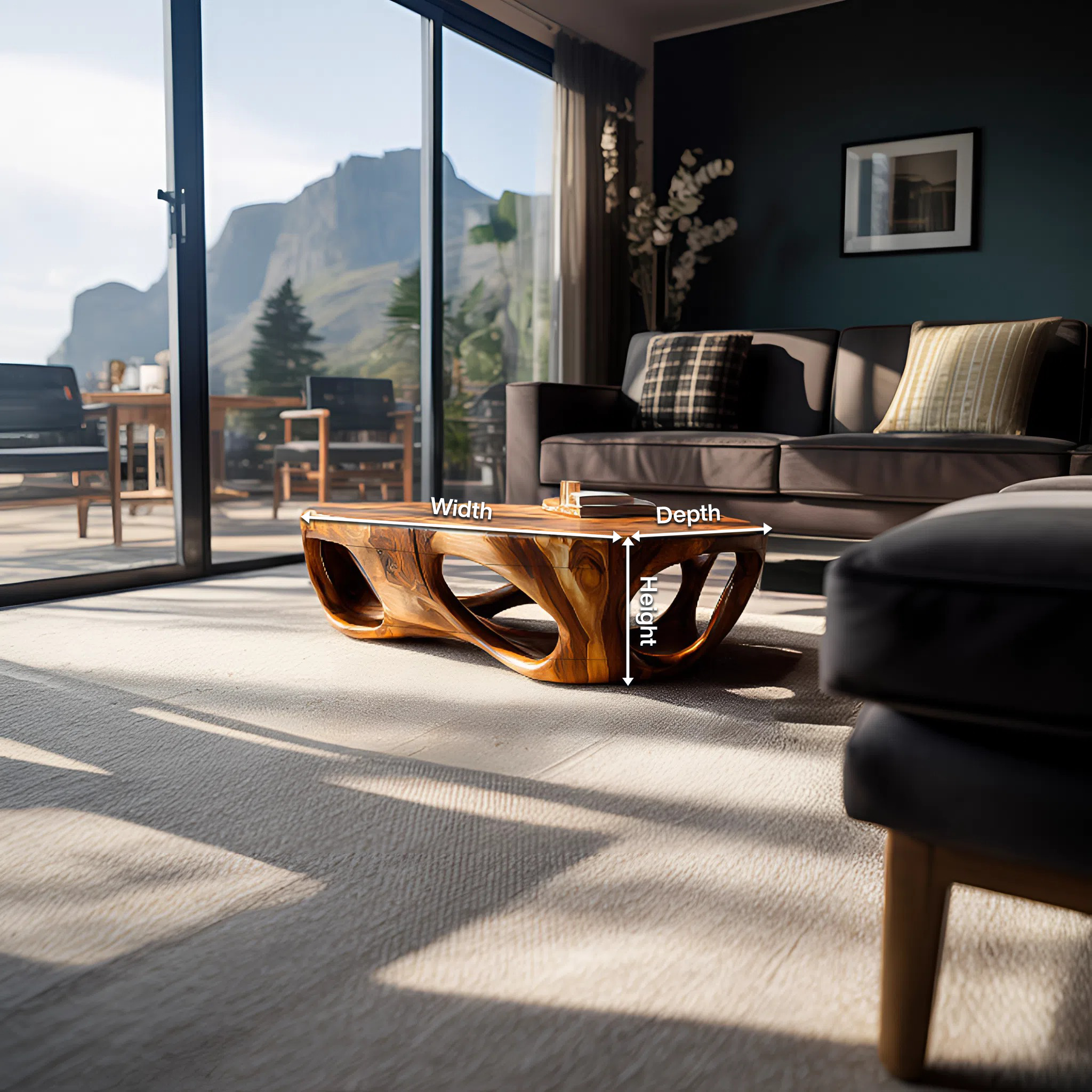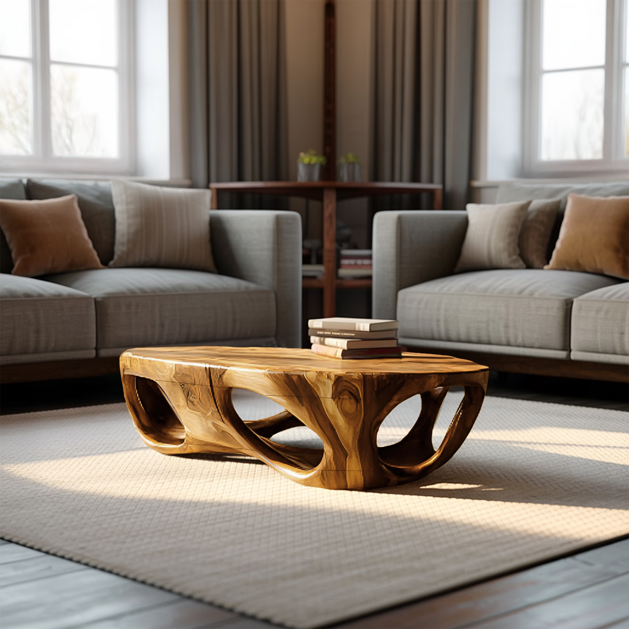 - Functional Benefits: The broad tabletop provides ample space for books, trays, or everyday items, while the carved hollow interior reduces visual weight and keeps the design feeling open. The interplay of solid wood and negative space adds movement and character, transforming everyday use into a visually engaging experience without cluttering the room.