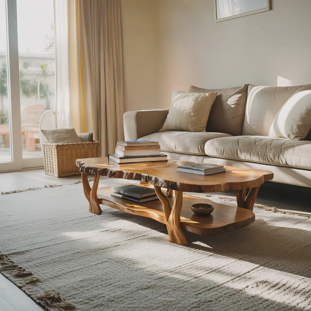 Shaped through layered form and natural edge character, Contemporary Live Edge Coffee Table Two Layered Design For Living introduces a balanced focal point that blends visual depth with everyday function. The live edge tabletop preserves the organic outline of the wood, while the second lower layer adds dimension and structure beneath, creating a sense of openness and flow. Together, these elements form a cohesive piece that feels grounded, expressive, and naturally integrated into the living space.