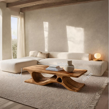 Refined curves establish a sense of balance in Contemporary Minimal Coffee Table For Living Room, a sculptural centerpiece designed to complement calm, thoughtfully layered interiors. The tabletop appears light and composed, resting above a fluidly carved base that introduces gentle movement without visual excess. Natural wood grain flows continuously through the form, revealing depth and organic character while maintaining a clean, understated presence. Positioned at the center of the seating area, this coffee table quietly anchors the space with warmth and composure.