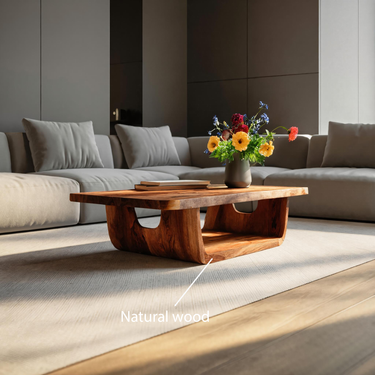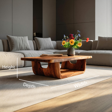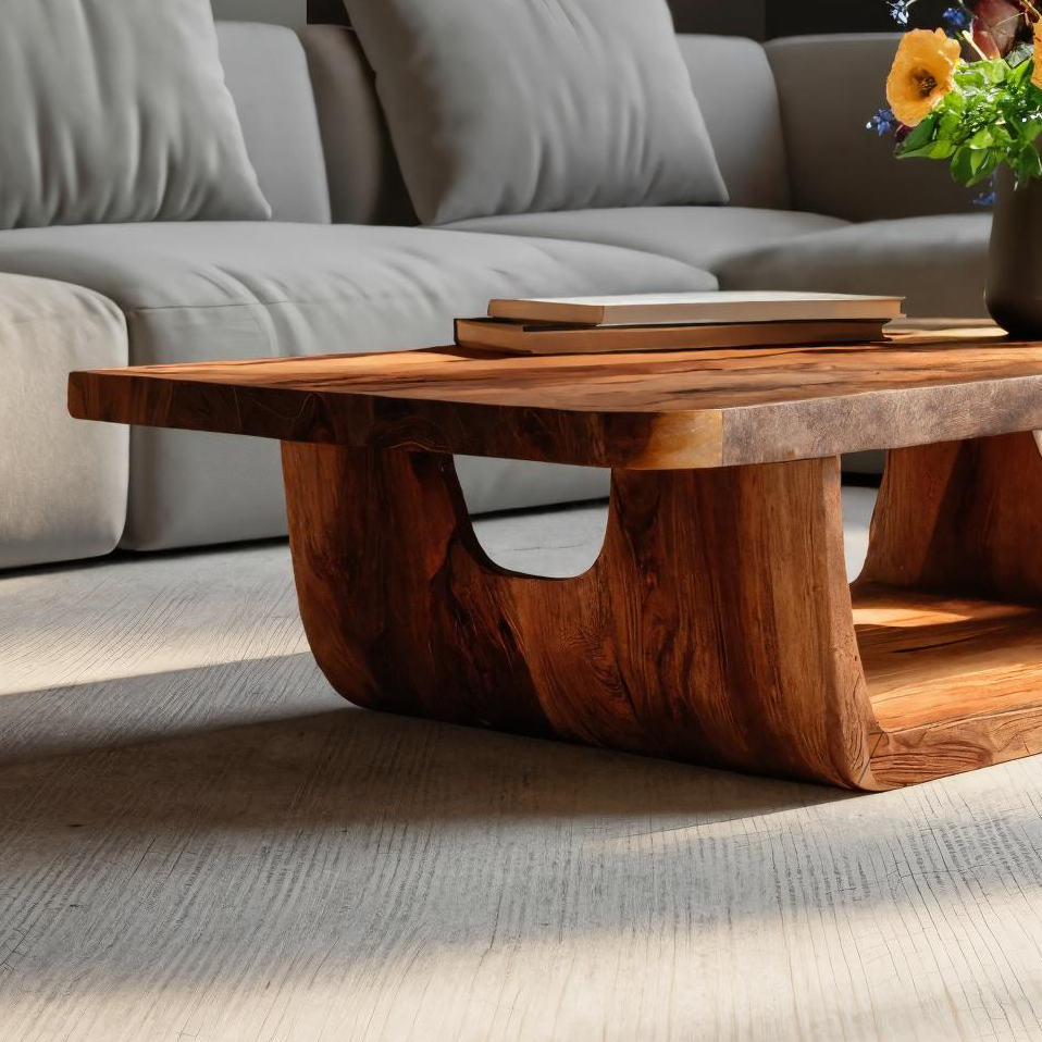 Defined by softened geometry and continuous carving, Elegant Coffee Table With Smooth Sculptural Lines For Living presents a low, grounded form where solid wood is shaped into gentle curves and open volumes. The tabletop appears to float above a sculpted base, with negative space allowing light to pass through and reveal the natural movement of the wood grain. Each line flows seamlessly into the next, creating a calm and cohesive visual presence within the room.
