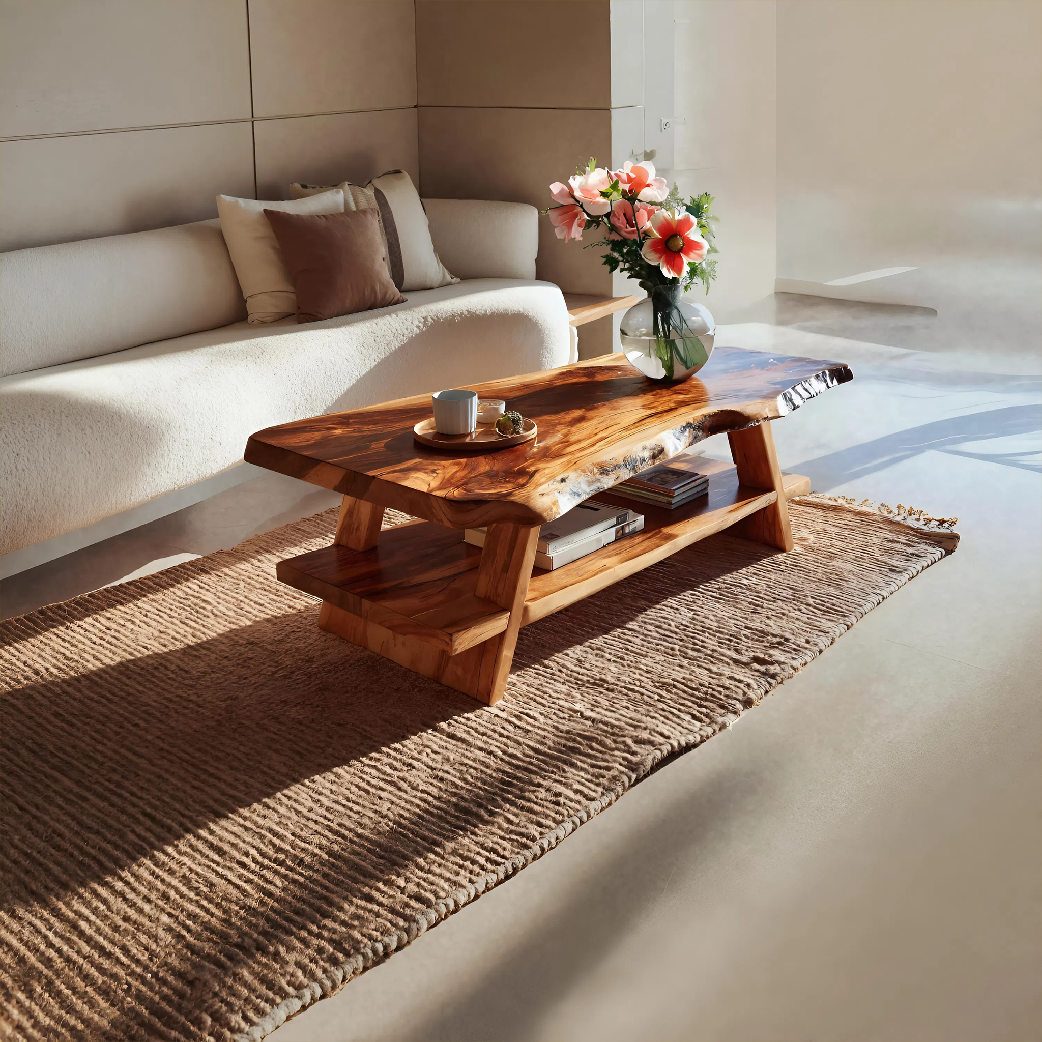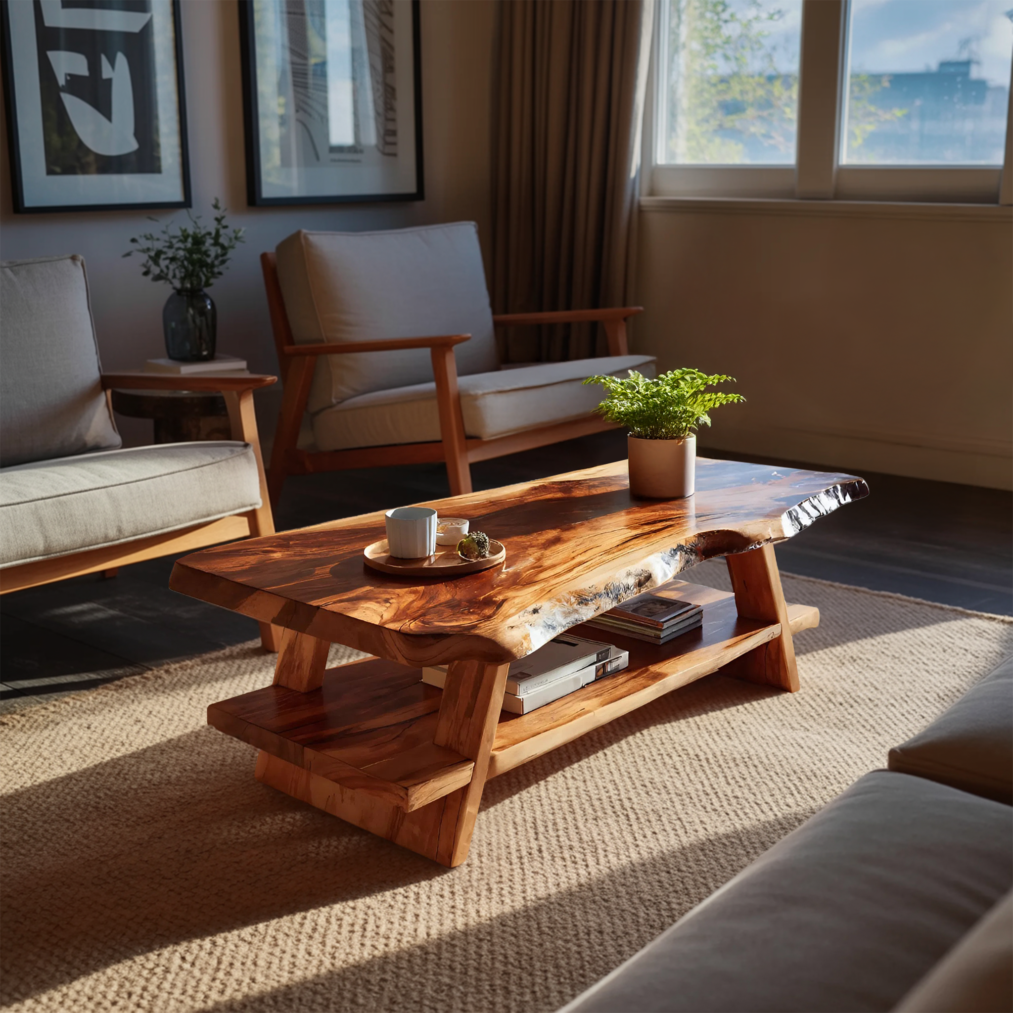 - Functional Benefits: The generous tabletop provides ample space for serving, books, or decorative accents, while the lower shelf offers convenient storage for magazines or everyday items. The combination of live edge detailing and open structure maintains a light visual presence, helping the space feel organized and inviting.