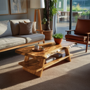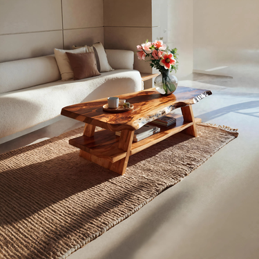 Shaped by natural edge expression and grounded proportion, Handcrafted Coffee Table Live Edge And Lower Shelf For Living brings warmth and visual depth to everyday living spaces. The live edge tabletop preserves the wood’s original contour, revealing flowing grain patterns and subtle surface variation, while the integrated lower shelf adds structure and balance to the overall form. Together, these elements create a table that feels both functional and visually engaging without dominating the room.
