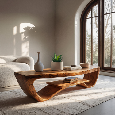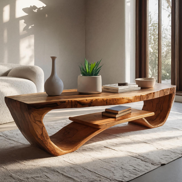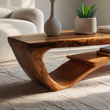 Guided by fluid form and grounded presence, Luxury Coffee Table With Shelf For Living Room introduces a sculptural centerpiece that blends visual softness with everyday practicality. The table’s flowing silhouette creates a sense of movement from every angle, while the integrated lower shelf adds depth and balance to the overall composition. Natural wood grain runs continuously across the surface, offering an inviting platform for books, décor accents, or daily essentials, while the open form keeps the space feeling calm and intentional.