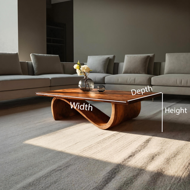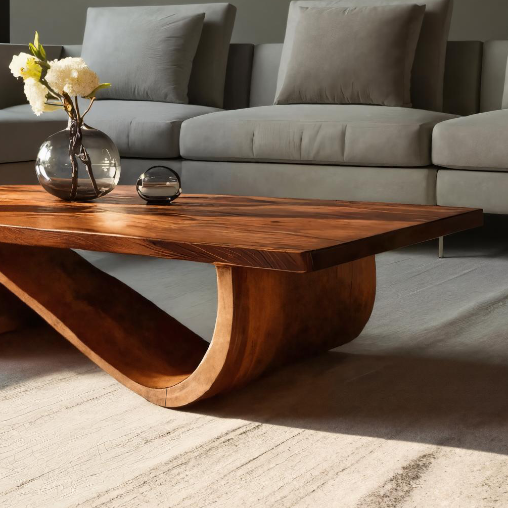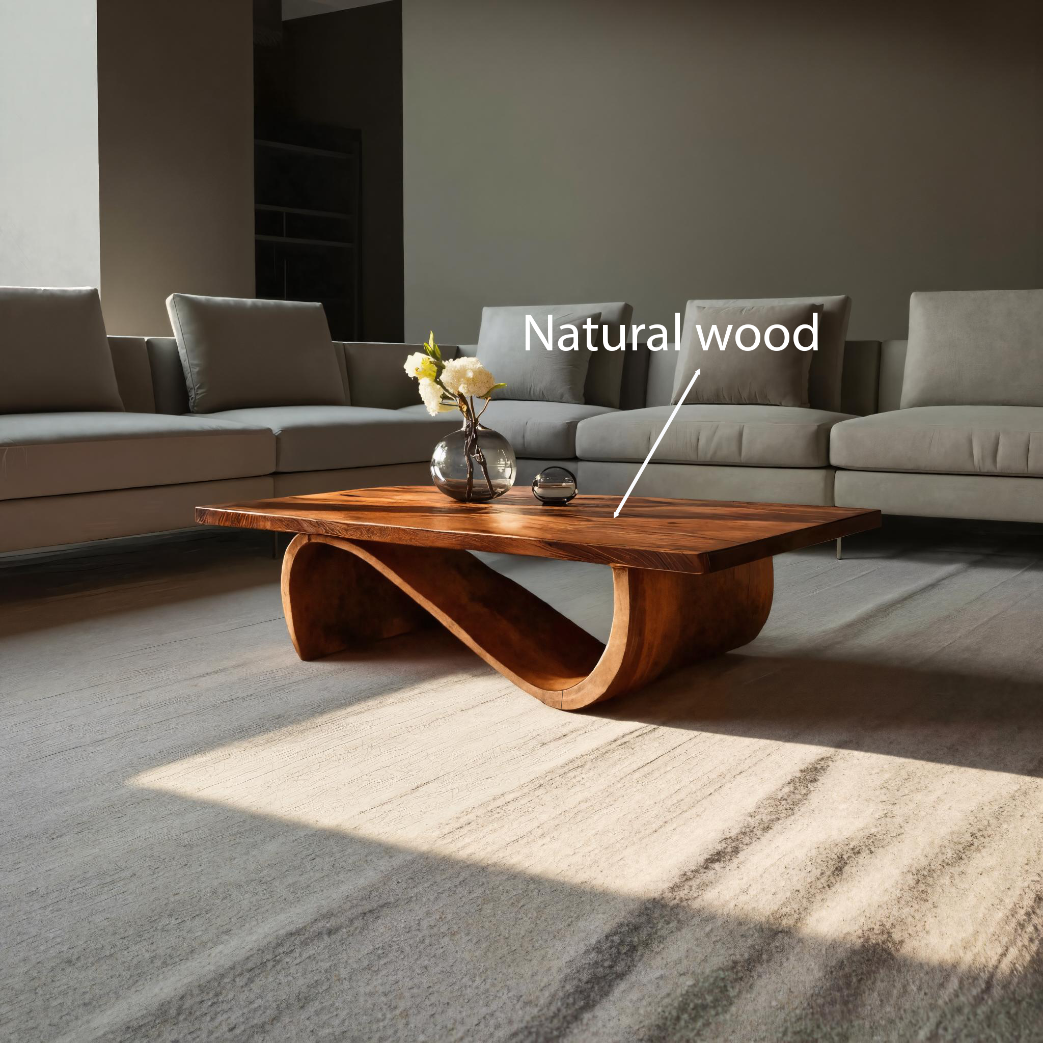 Shaped through restrained curves and sculpted balance, Minimalist Coffee Table Unique Base Design For Living Room presents a low-profile composition where solid wood is carved into a continuous flowing base beneath a clean, rectangular surface. The sculptural support forms a smooth, looping silhouette, allowing negative space to remain open and visually light. Natural wood grain follows each curve, creating subtle movement that reveals itself as light shifts across the table.