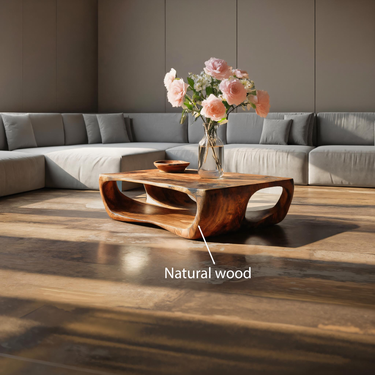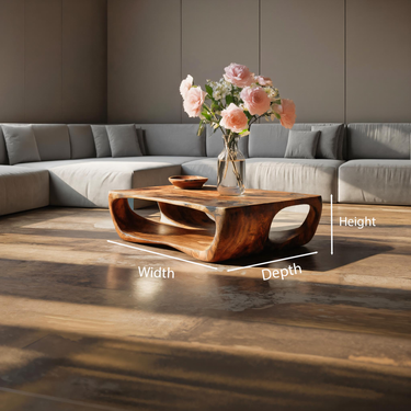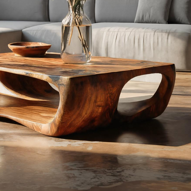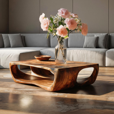 Shaped through fluid curves and grounded balance, Modern Coffee Table Sculpture Design For Living Room presents a low-profile sculptural form where solid wood is carved into soft openings and continuous contours. The tabletop rests above flowing negative space, allowing light to pass beneath and highlight the natural grain movement throughout the piece. Each curve transitions smoothly into the next, creating a calm visual rhythm that feels intentional and cohesive within the room.