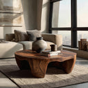 Soft sculpted contours define Organic Wooden Coffee Table For Home Interiors, where a rounded tabletop sits above a gently carved base with flowing openings that echo natural wood movement. The base curves inward and outward to create smooth arch-like spaces beneath the table, allowing light to pass through while emphasizing the expressive grain patterns across the wood surface. Its low circular form naturally anchors the seating area while introducing warmth and visual balance to the room.