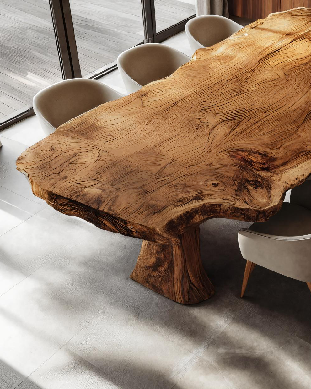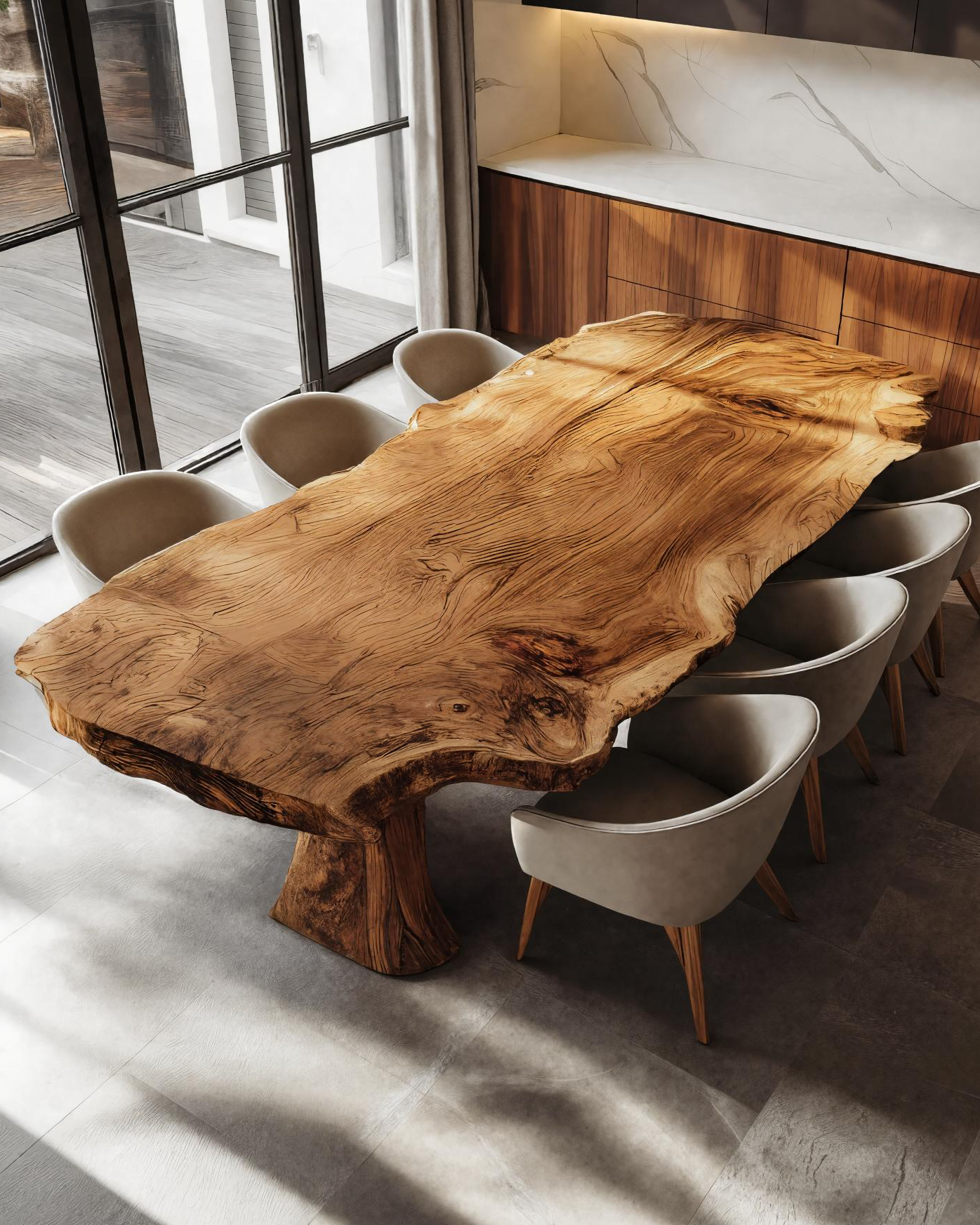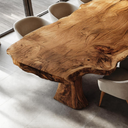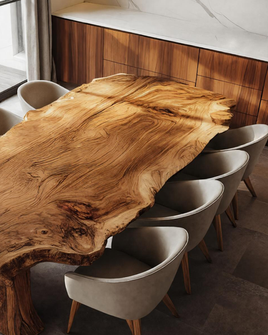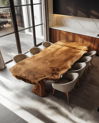 Created to complement modern living with the beauty of natural wood, the Contemporary Dining Table For Kitchen And Dining Areas showcases a stunning single-slab live edge top with dramatic grain movement and sculptural form. The thick solid wood surface retains its organic contours, bringing a sense of warmth and artistry into any space. Its bold, monolithic base provides exceptional stability while enhancing the table’s sculptural presence. Perfect for family meals, gatherings, or everyday dining, this piece blends contemporary elegance with the timeless soul of handcrafted woodwork.