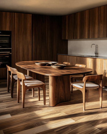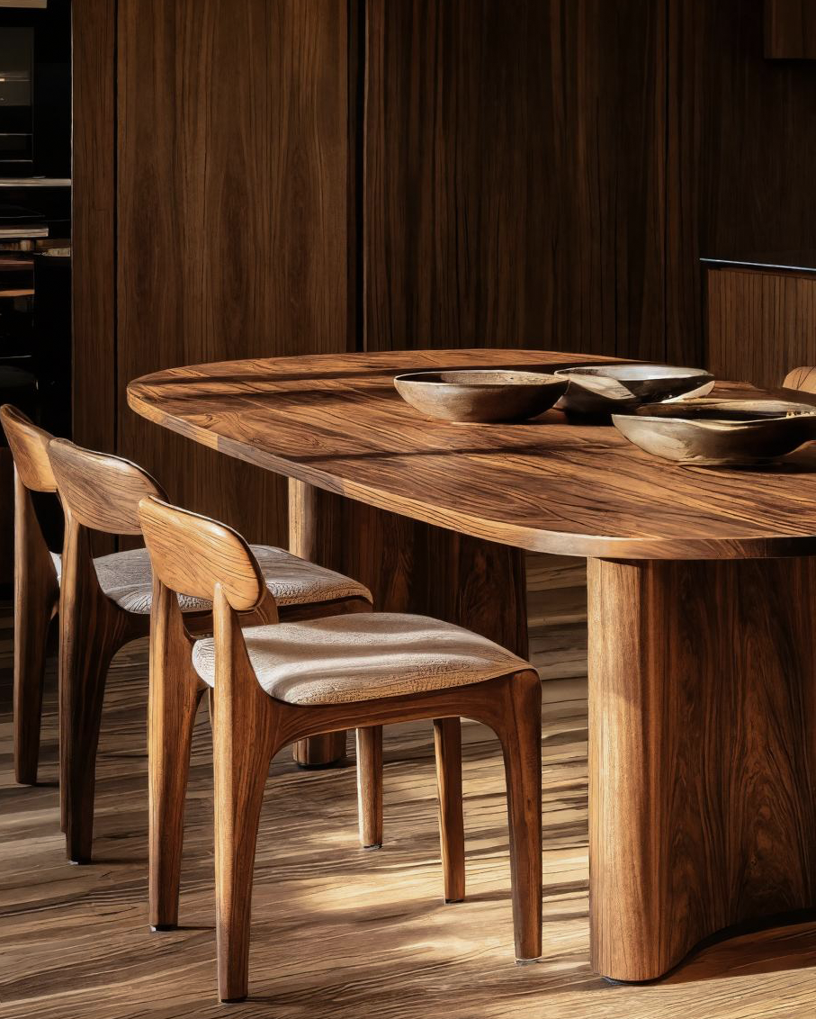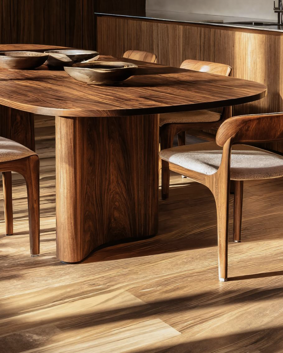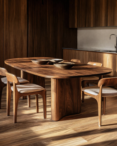Crafted to complement refined contemporary spaces, the Modern Dining Table For Contemporary Home Interiors showcases a sleek, solid-wood silhouette with smooth lines and an elegant oval tabletop. Supported by a sculptural pedestal base, it brings balance, warmth, and modern sophistication to any dining area. The rich wood grain adds natural depth, making this table a statement piece designed for both daily meals and special gatherings.