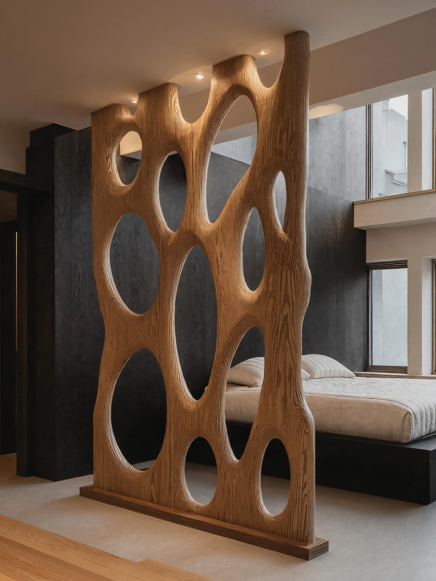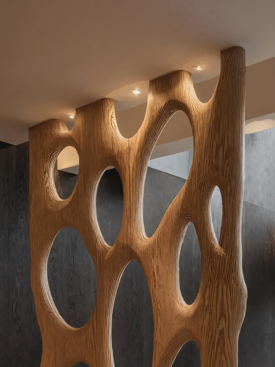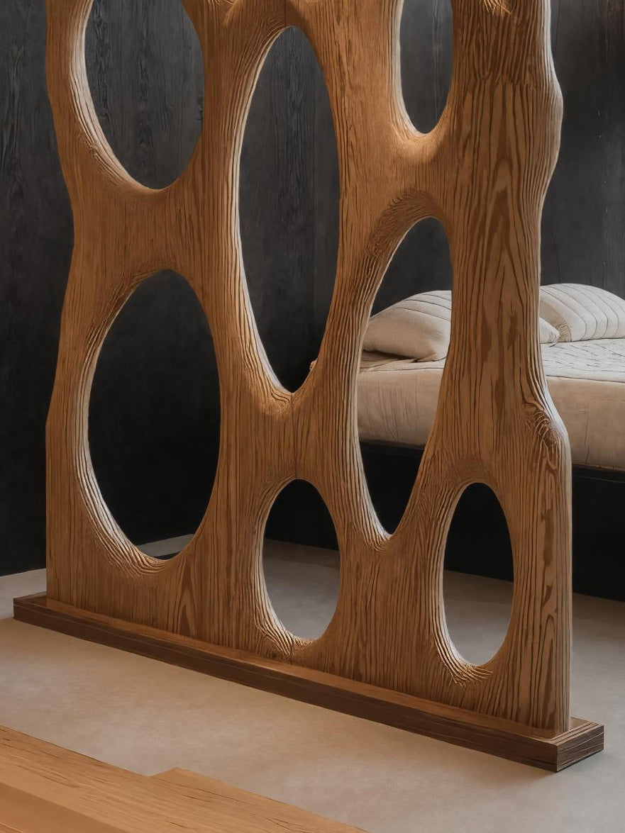 Introduce sculptural elegance into your space with the Contemporary Organic Room Divider Oval For Bedroom, designed to add gentle separation while maintaining an open and harmonious atmosphere. The flowing carved ovals create a striking play of shadows and light, turning this divider into a functional architectural feature and an artistic focal point.