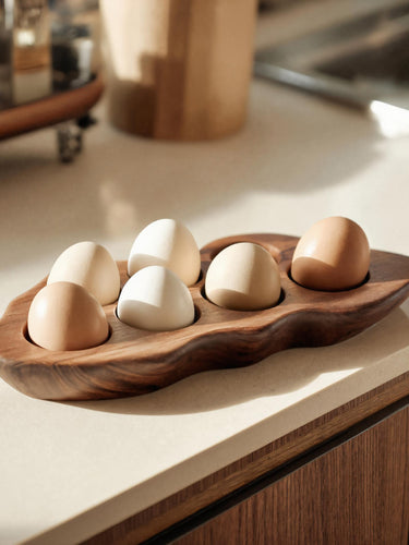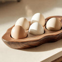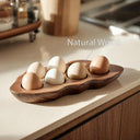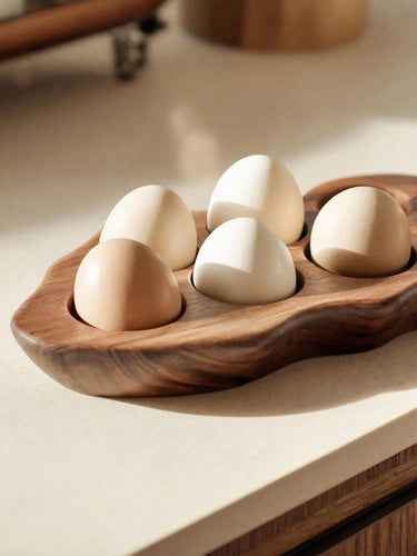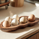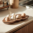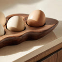 This egg holder features a smooth carved form with gently flowing contours that follow the natural lines of the wood. The rounded egg slots are evenly spaced and recessed, creating a clean yet sculptural look. Its organic silhouette makes it a subtle decorative accent while remaining practical for everyday use.