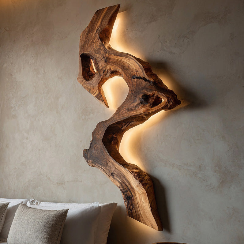 Sculptural natural form defines Artistic Solid Wood Wall Light For Modern Interior, transforming lighting into a striking wall centerpiece. The organic silhouette follows the natural curves of the wood, creating a flowing vertical composition that feels both raw and elegant. Soft backlighting gently outlines the sculptural edges, allowing the natural grain, knots, and textures of the wood to stand out while casting a warm ambient glow across the wall.