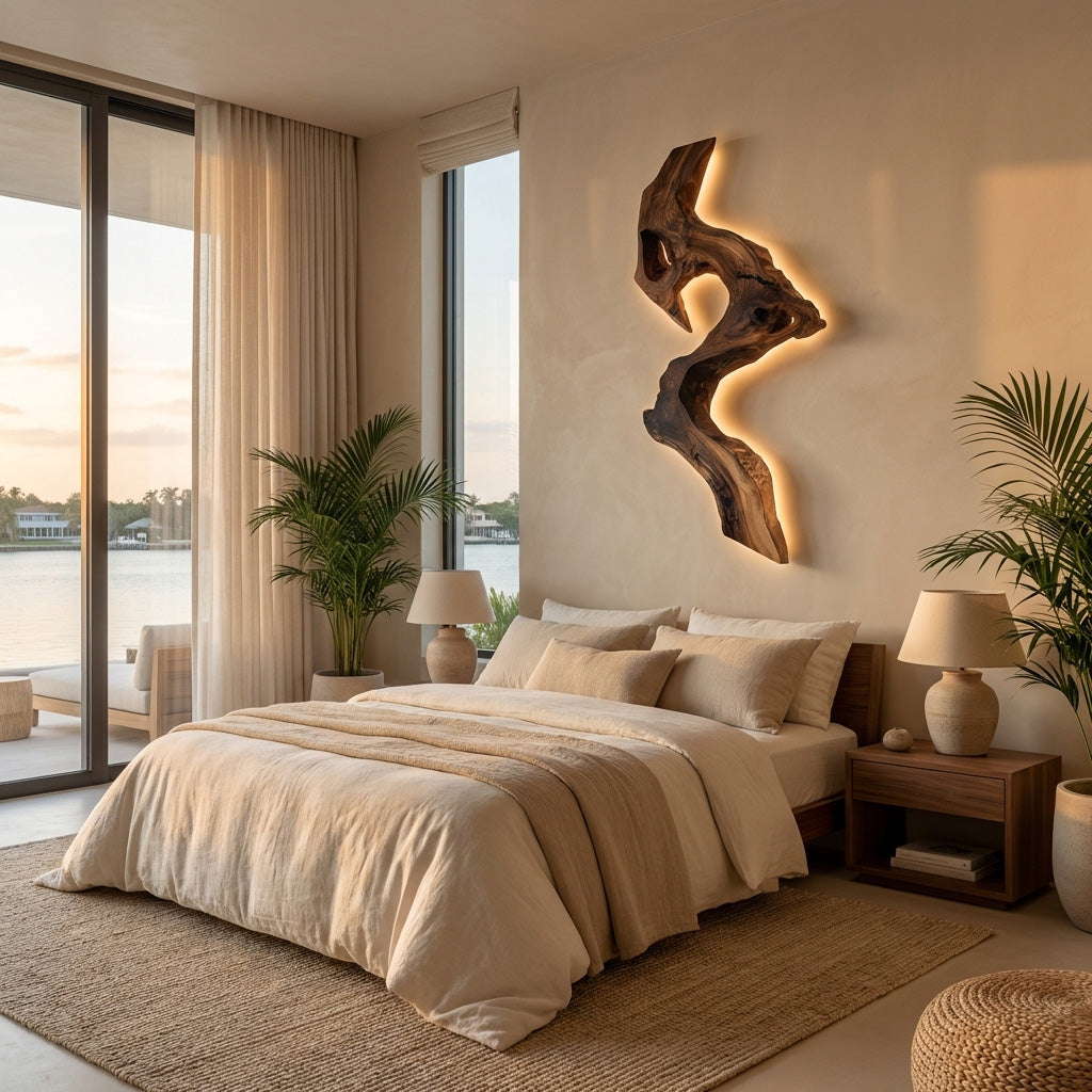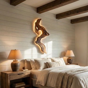 - Functional Benefits: Integrated backlighting creates a soft halo effect behind the wood sculpture, producing warm ambient illumination without harsh glare. The combination of light and natural texture adds depth to the wall while creating a calm, inviting mood in the room.