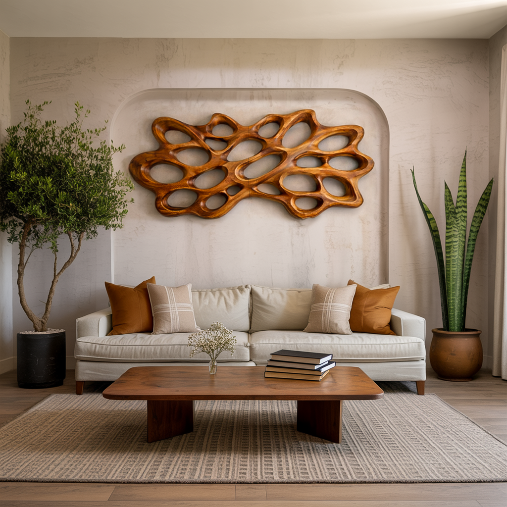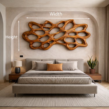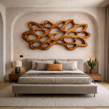 Sculptural organic pattern shapes Contemporary Wood Wall Art For Bedroom Wall, bringing fluid movement and natural warmth to the space above the bed. Flowing natural contours form an interconnected network of carved openings, creating a dynamic visual rhythm that draws the eye across the wall. The rich grain of natural wood enhances the depth and character of the piece, allowing light to interact with the sculpted surfaces and softly highlight the organic structure.