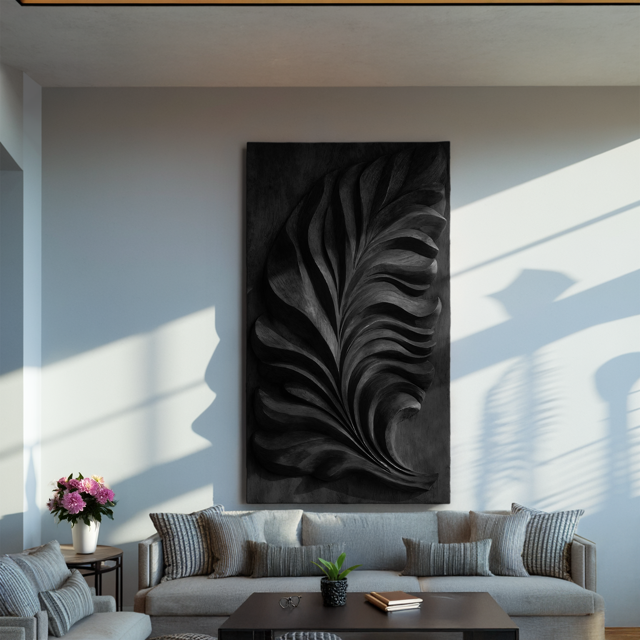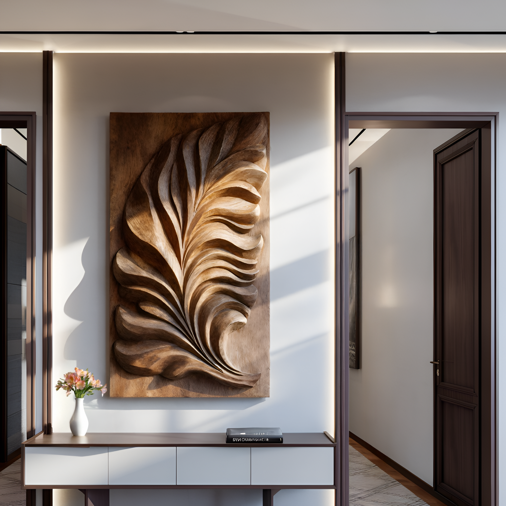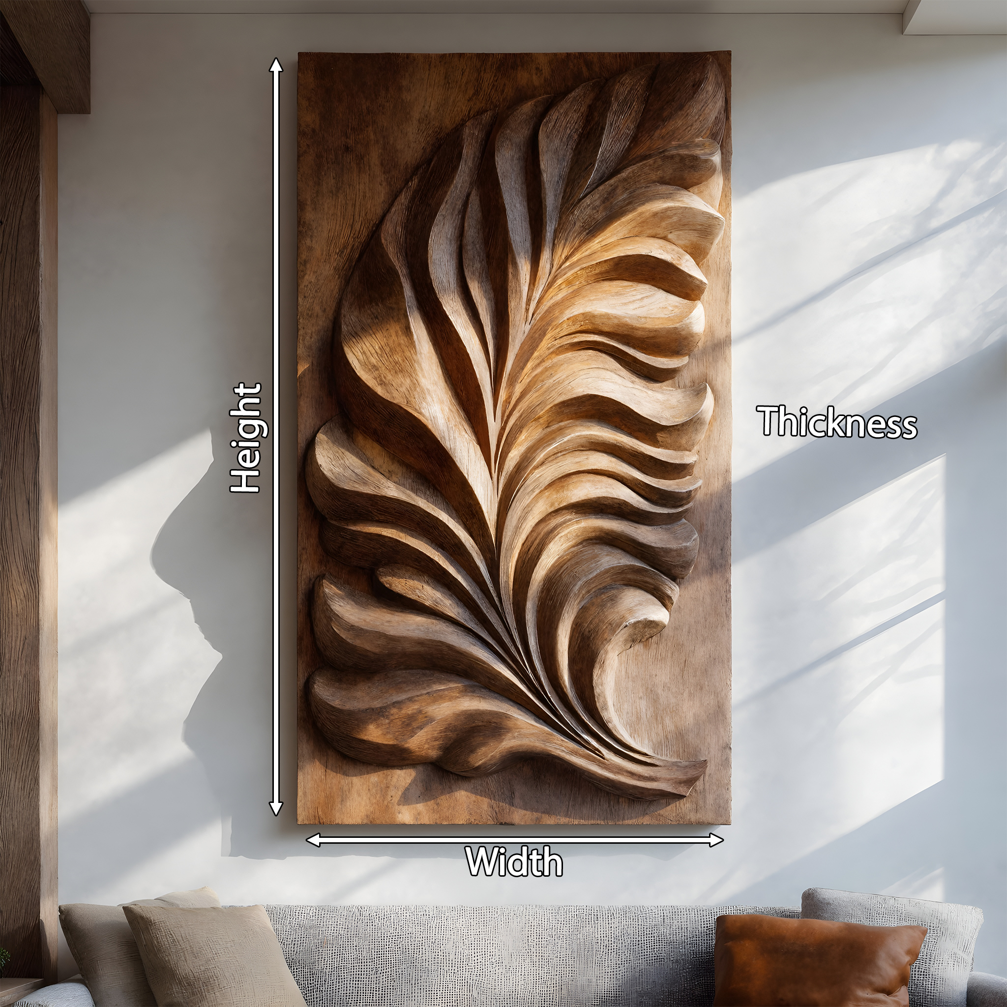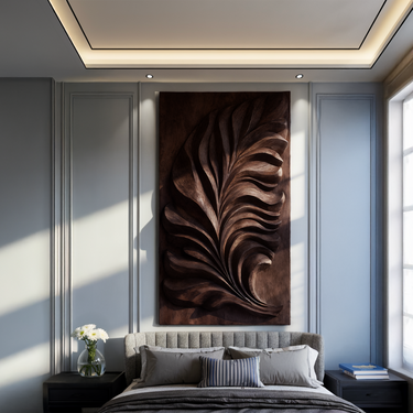 - Functional Benefits: The carved feather relief adds dimension and visual movement to flat surfaces while maintaining an open, uncluttered feel. As a wall-mounted piece, it preserves floor space and introduces natural texture, helping soften architectural lines and connect the room through material continuity.