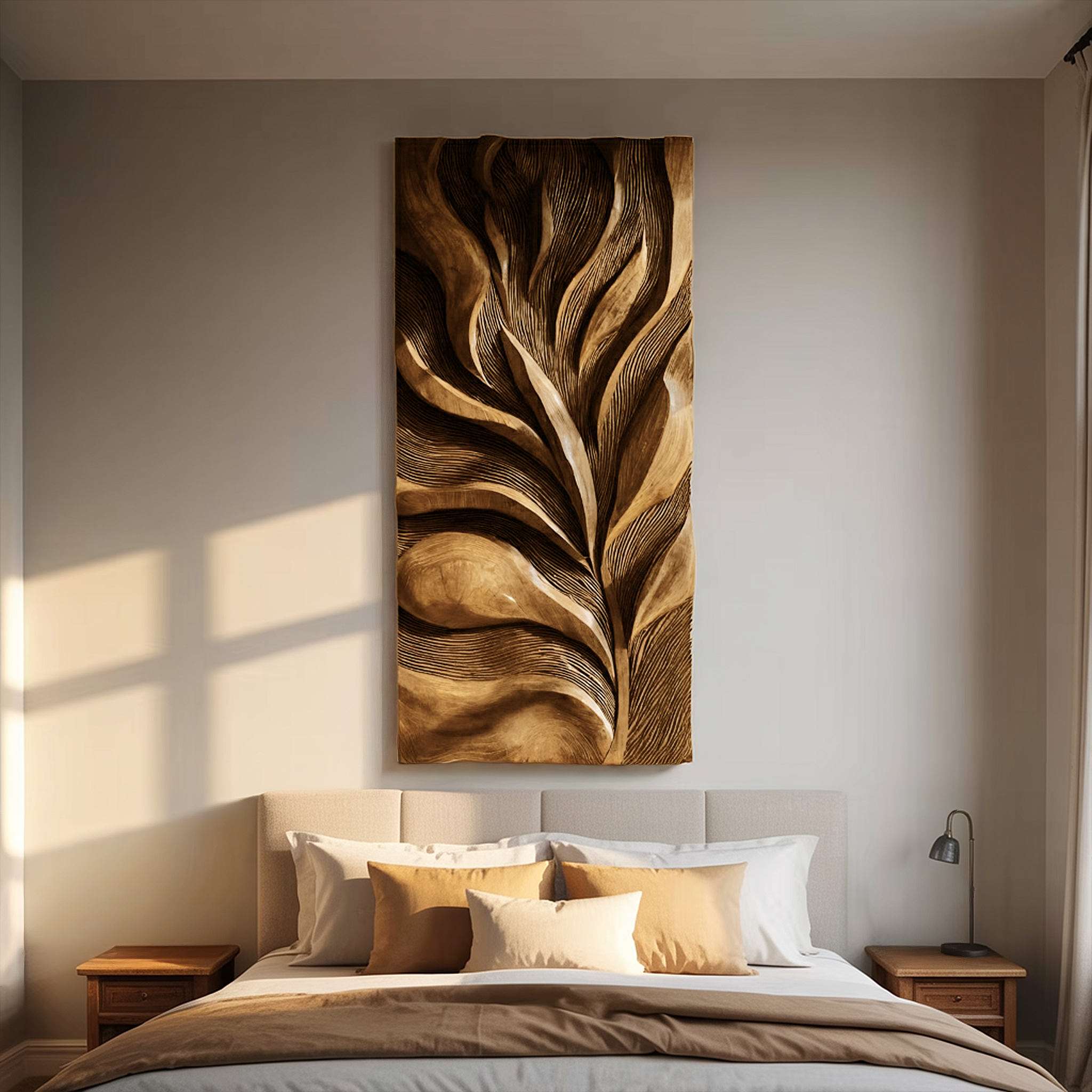 Layered movement and flowing grain define the Modern Organic Wooden Feather Wall Panel For Living Room, shaping a vertical feather form that feels sculpted by natural rhythm rather than symmetry. The carved surface unfolds in overlapping curves, where warm wood tones transition seamlessly between light and shadow. Each ridge follows the grain’s direction, creating a sense of motion that feels calm, grounded, and quietly expressive.