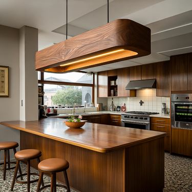 Sleek elongated wood form defines Modern Wooden Pendant Lamp For Kitchen, where a carved wooden beam appears to float gracefully above the dining or kitchen area. The gently hollowed underside reveals a soft integrated light channel that casts warm illumination downward, while the natural wood grain flows continuously across the sculpted surface. Suspended from minimal cables, this lighting piece brings warmth, balance, and sculptural character to contemporary kitchen and dining interiors.