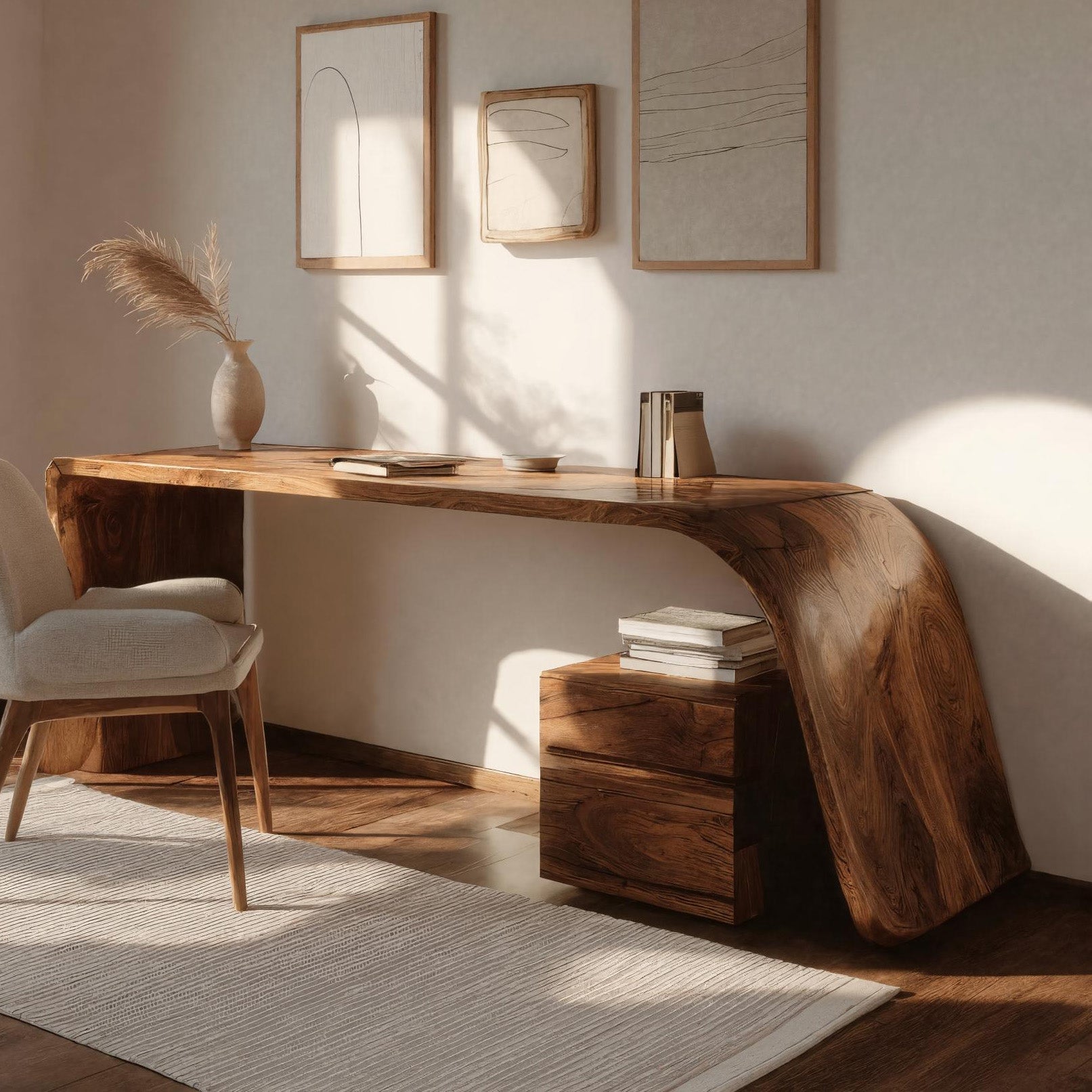 Flowing wood lines extend across Minimal Wooden Office Desk For Home Office, where a continuous surface curves gently from one end to the other, forming both the tabletop and structural support. The sculpted edge highlights the natural grain patterns, allowing the warm wood tones to move fluidly through the entire form. Its elongated silhouette creates a calm workspace while maintaining an open visual presence within the room.
