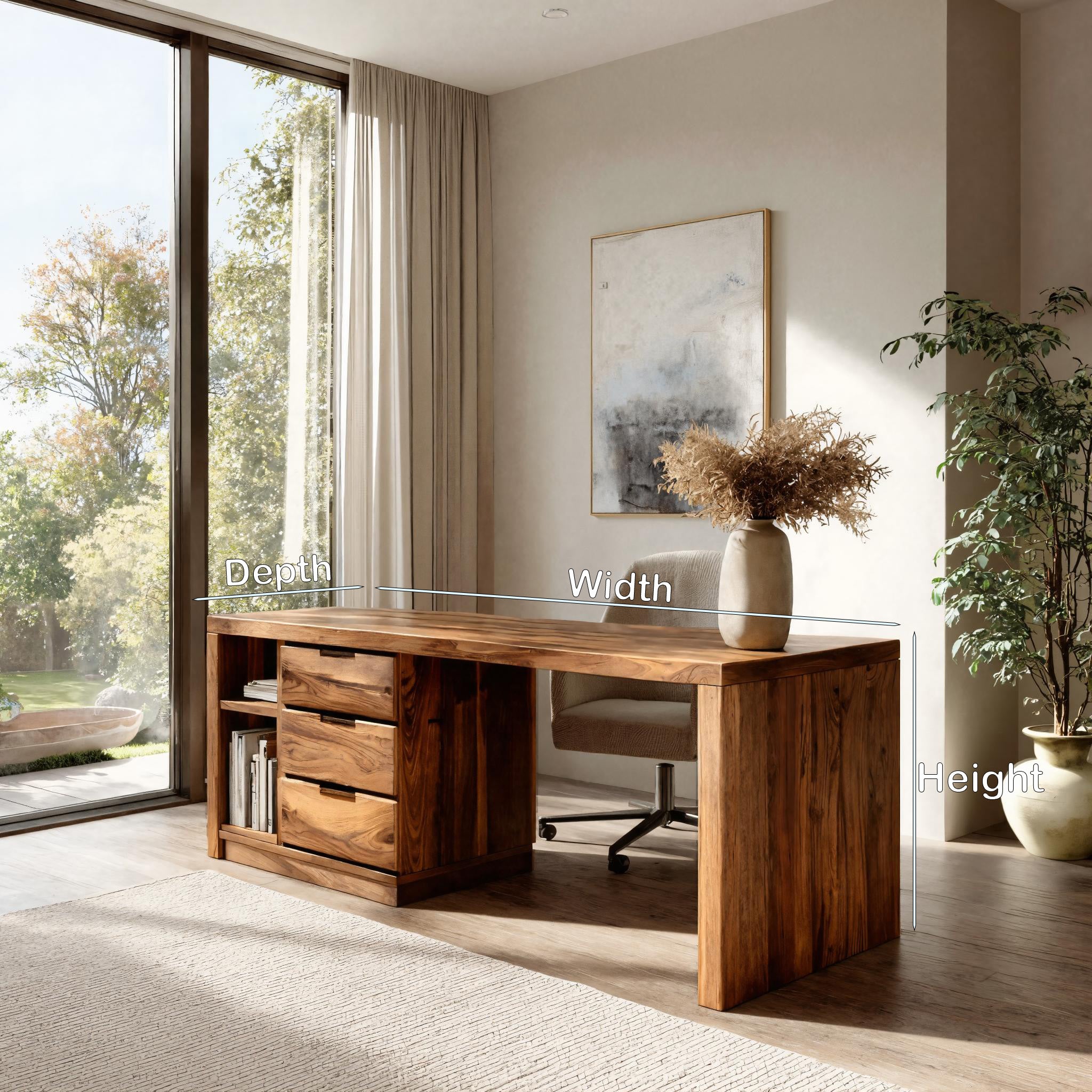 - Versatile Placement: Ideal for home offices, study rooms, creative studios, or quiet work corners near natural light. Its balanced proportions allow the desk to function comfortably against a wall, near large windows, or within a dedicated workspace layout.