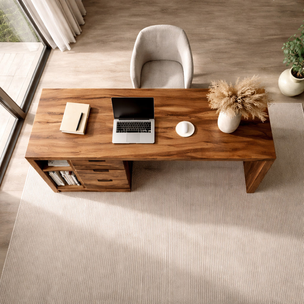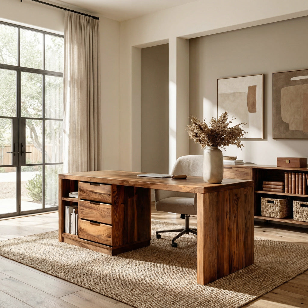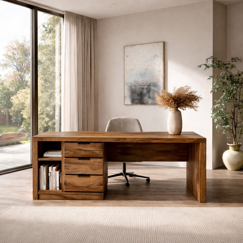 Balanced natural wood surfaces frame our Minimalist Wooden Desk With Storage For Home Office, creating a workspace that blends practical organization with a warm visual presence. The wide desktop extends across a structured base while integrated drawers and shelving introduce layered storage within the design. Flowing natural grain patterns move across the wood panels, adding depth and character while maintaining a calm, uncluttered atmosphere for focused work.