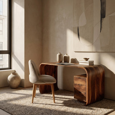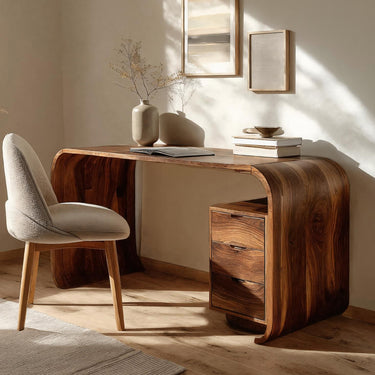 Gracefully curved wood panels shape our Modern Wooden Writing Desk With Curved Frame For Workspace, creating a flowing silhouette that softens the look of a traditional desk. The continuous wood frame bends smoothly from the tabletop down to the base, forming a sculptural structure that surrounds a compact drawer unit. Rich natural grain patterns move along the curved surfaces, giving the desk visual movement while maintaining a calm and balanced workspace.