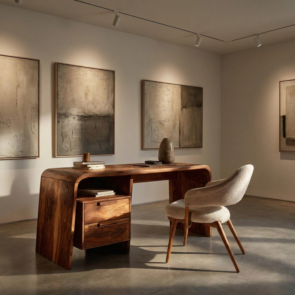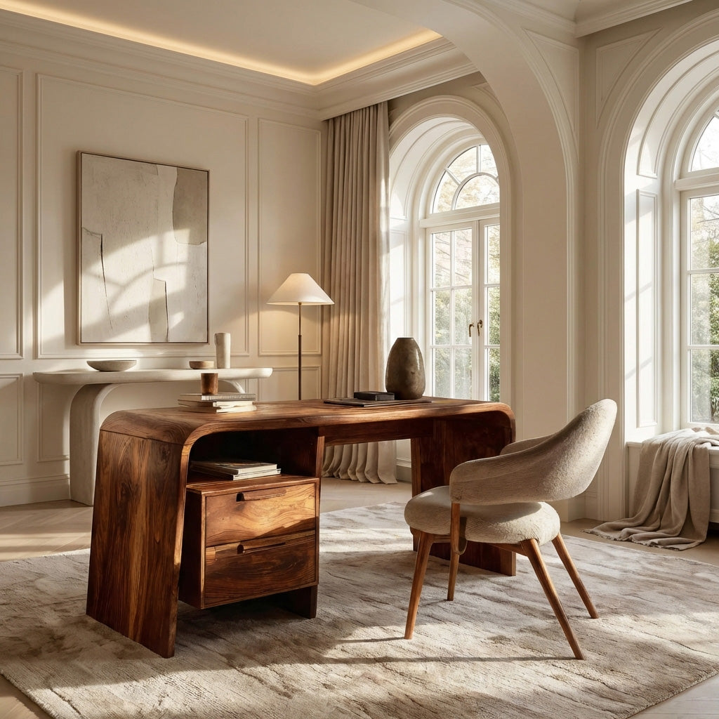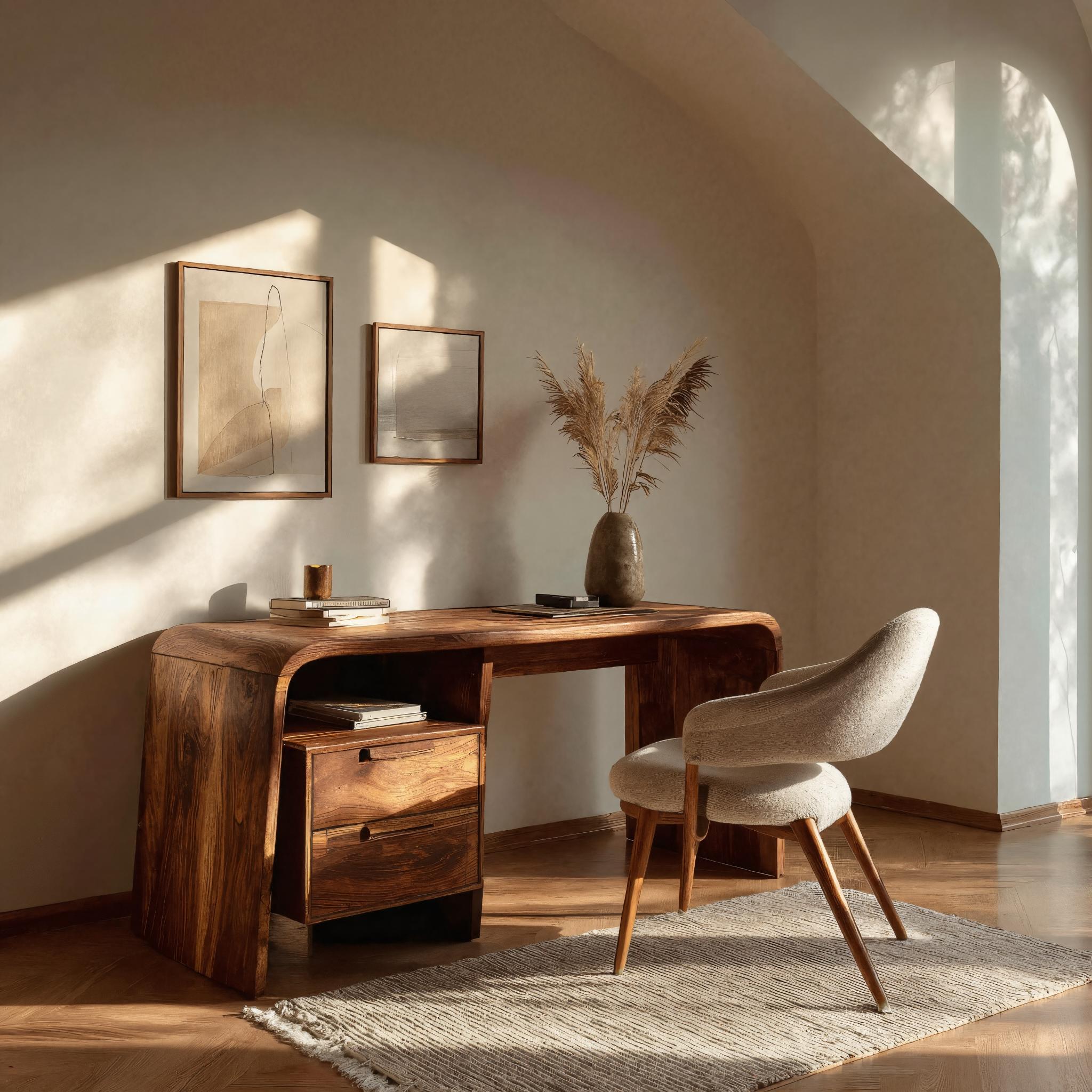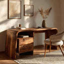 Smooth sculpted wood contours frame Modern Writing Desk With Drawers For Workspace, creating a balanced desk that blends organic form with everyday practicality. The softly curved side panels flow seamlessly into the tabletop, highlighting the natural wood grain while forming a calm and inviting workspace. Its compact yet expressive design introduces warmth and structure, making it a thoughtful centerpiece for focused work and creative moments.