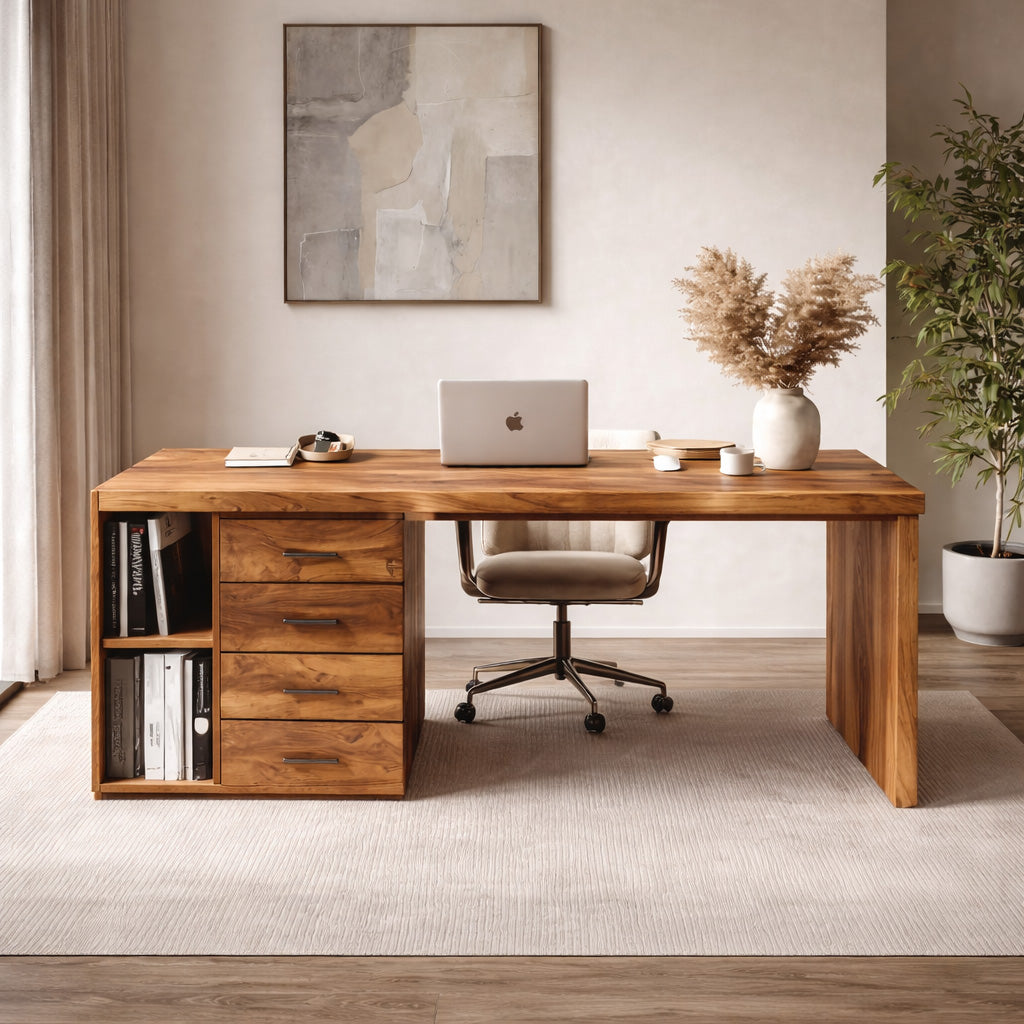 Sculpted natural wood surfaces highlight our Quiet Luxury Wooden Desk With Storage For Home Office, creating a workspace that blends functional organization with warm, organic character. The broad wooden desktop stretches across a sturdy frame while integrated drawers and open shelving provide balanced storage. Expressive grain patterns flow across every panel, giving the desk a grounded presence while keeping the design visually calm and inviting within a work environment.
