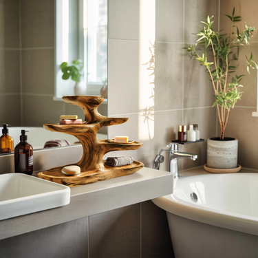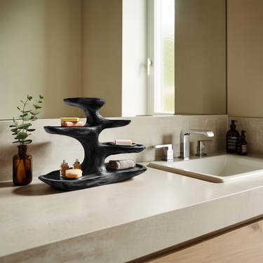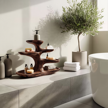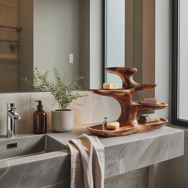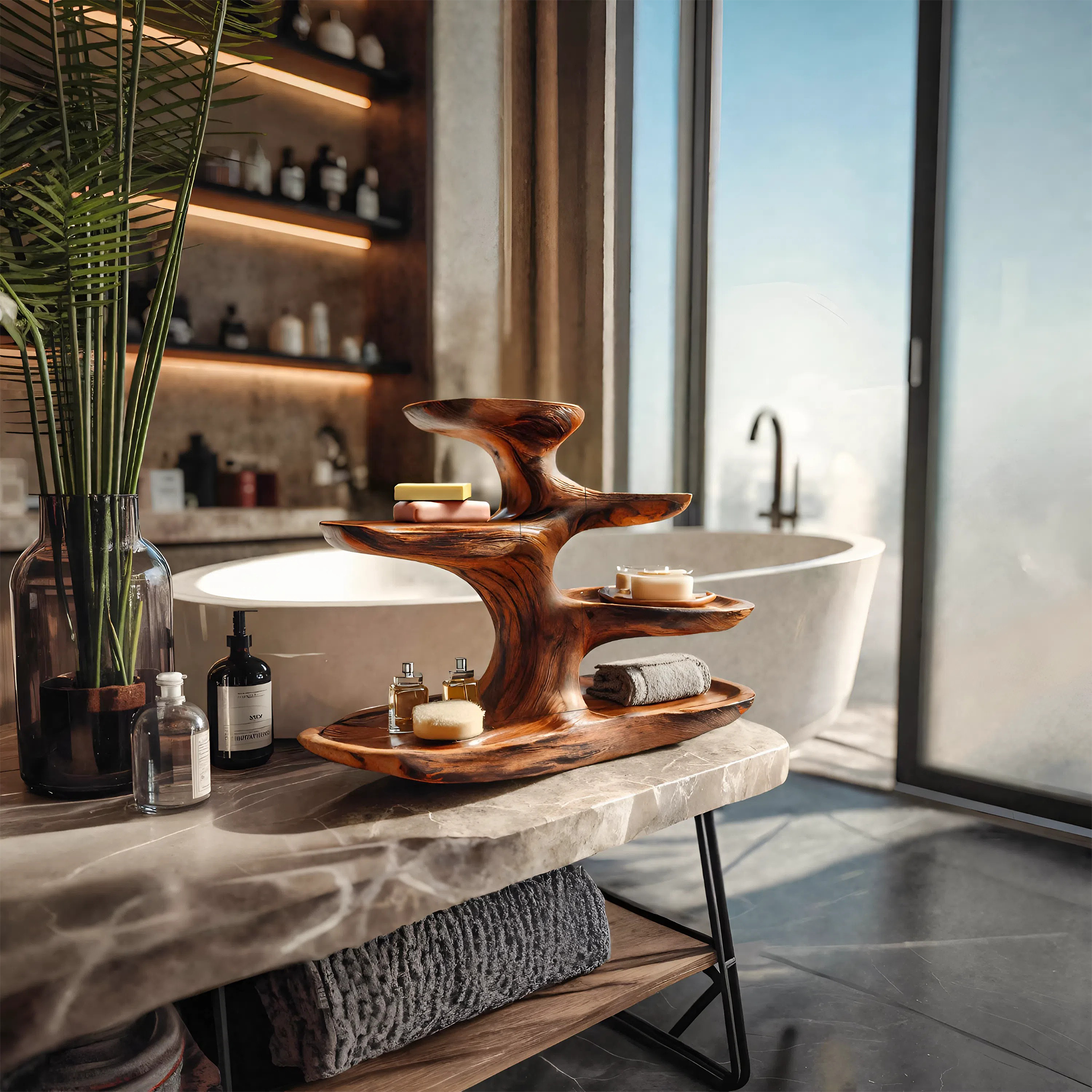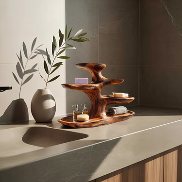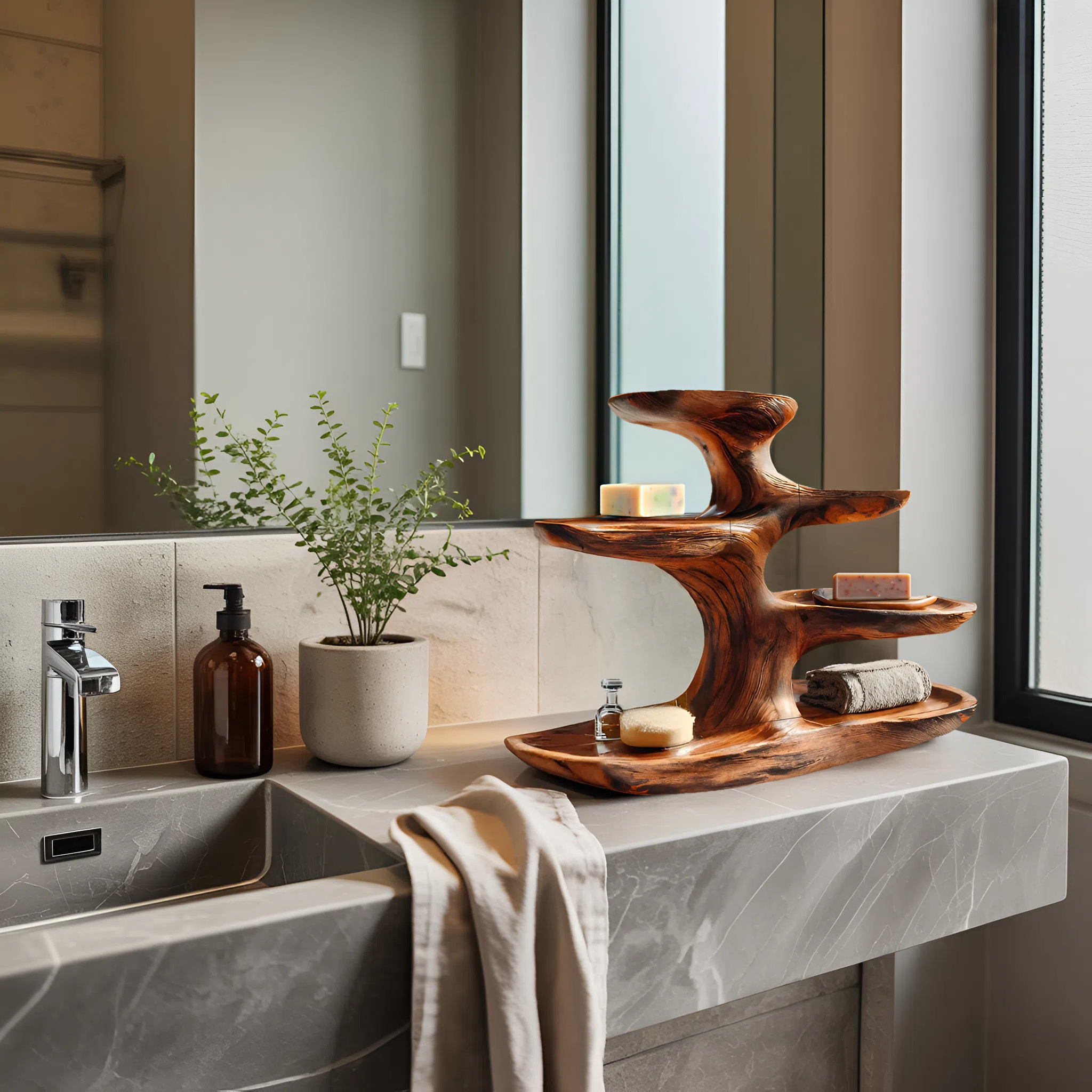 - Functional Benefits: The multi-tier layout provides clearly defined areas for soaps, skincare products, candles, and small accessories while keeping surfaces orderly. Soft transitions between levels reduce visual heaviness, allowing the shelf to serve both as practical storage and as a sculptural element within the space.