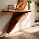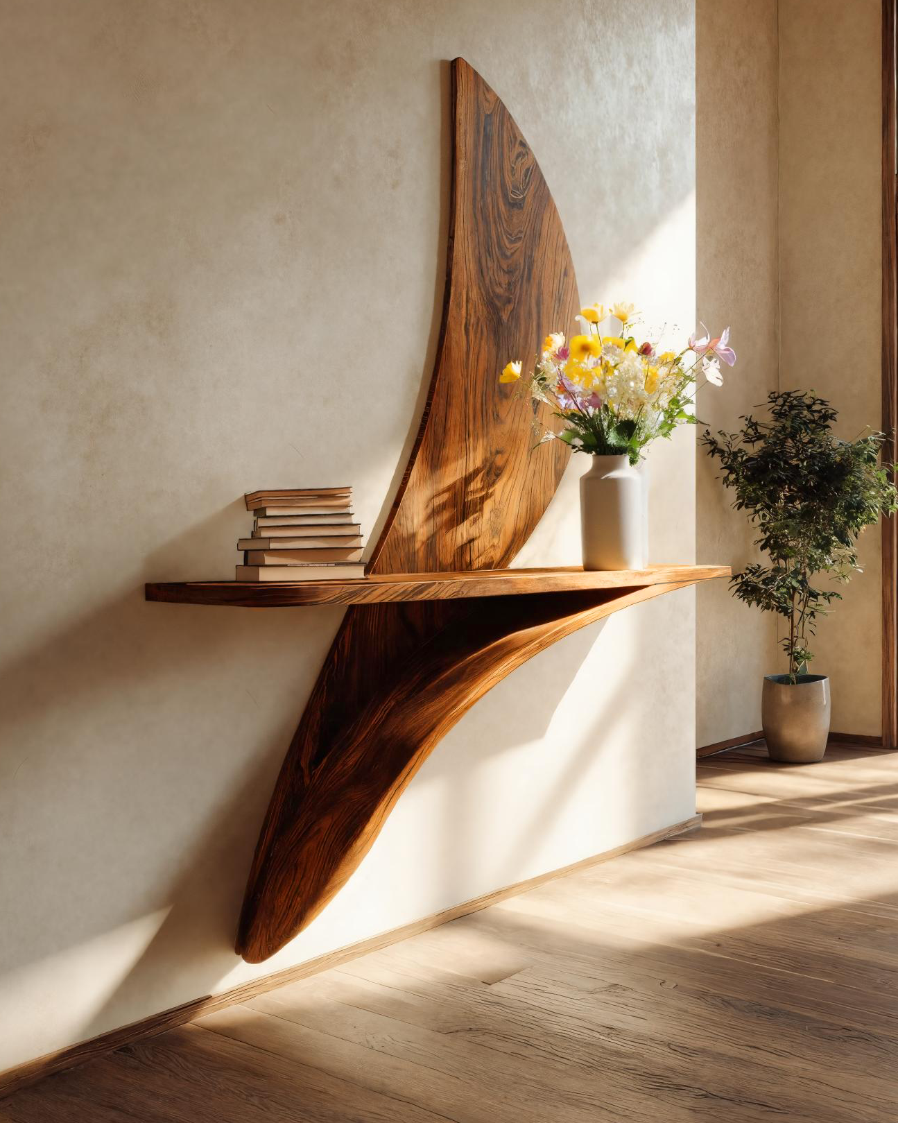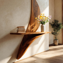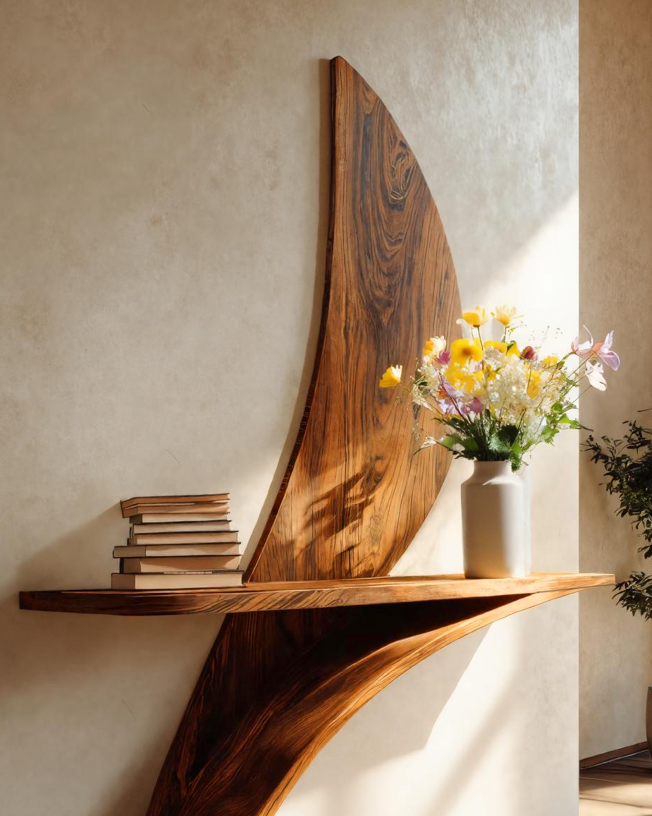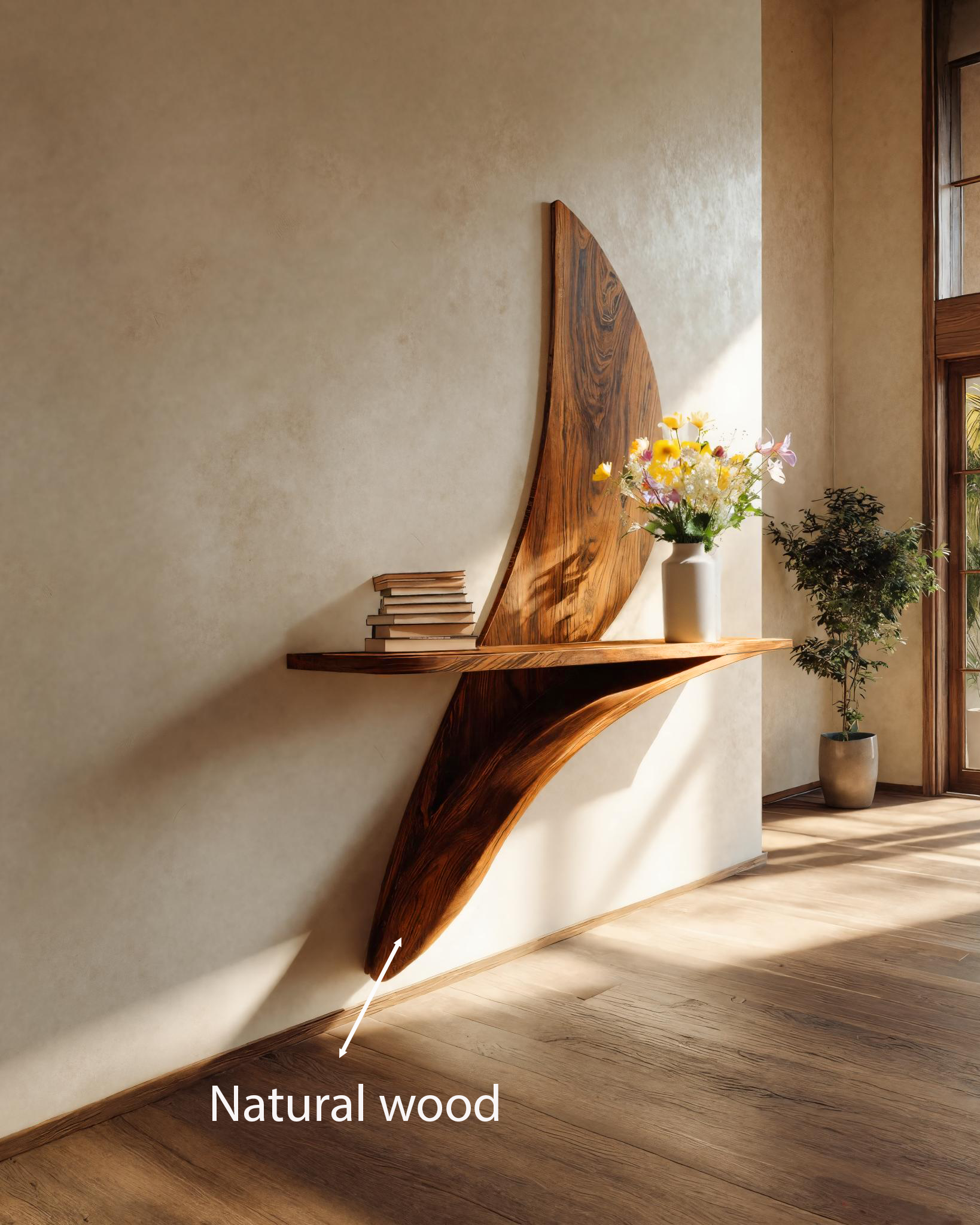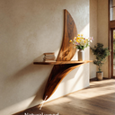 Designed as both a sculptural accent and a functional surface, the Artistic Wall Shelf For Modern Living Room brings an elegant sense of movement into interior spaces. Its sail-like silhouette is crafted from solid wood, rising gently from the wall and flowing into a curved support that feels lightweight yet grounded. The clean plane of the shelf provides space for books, vases, flowers, or small décor, while the vertical panel adds height and a visually striking profile.