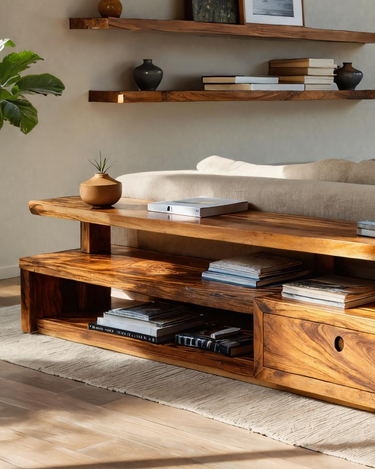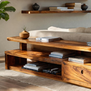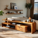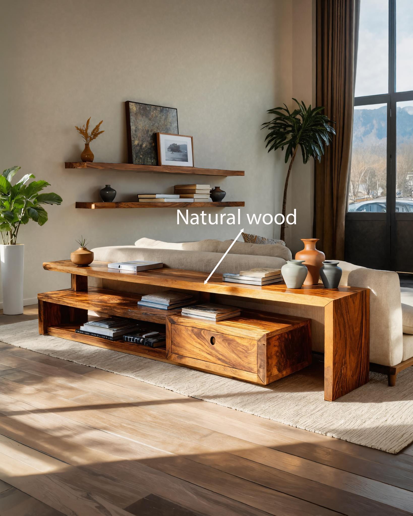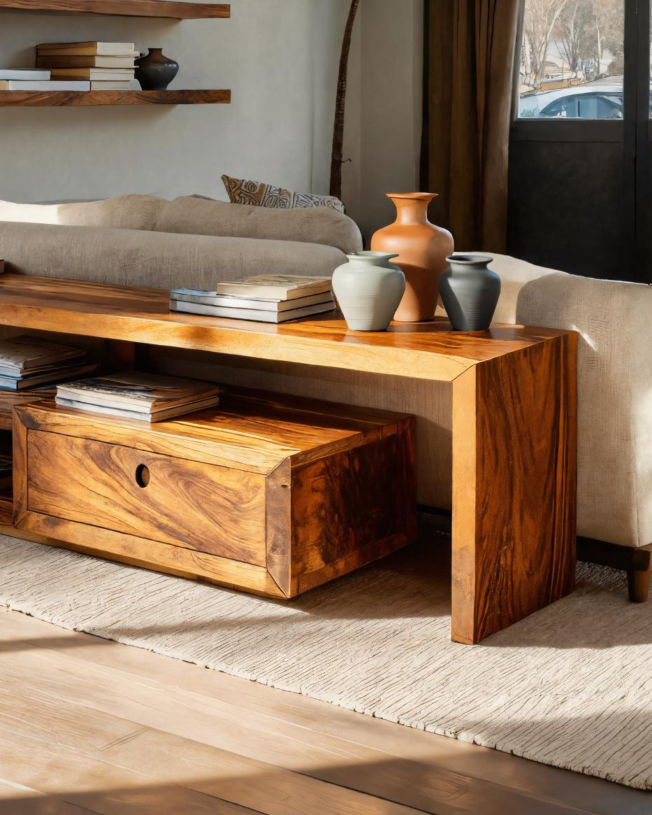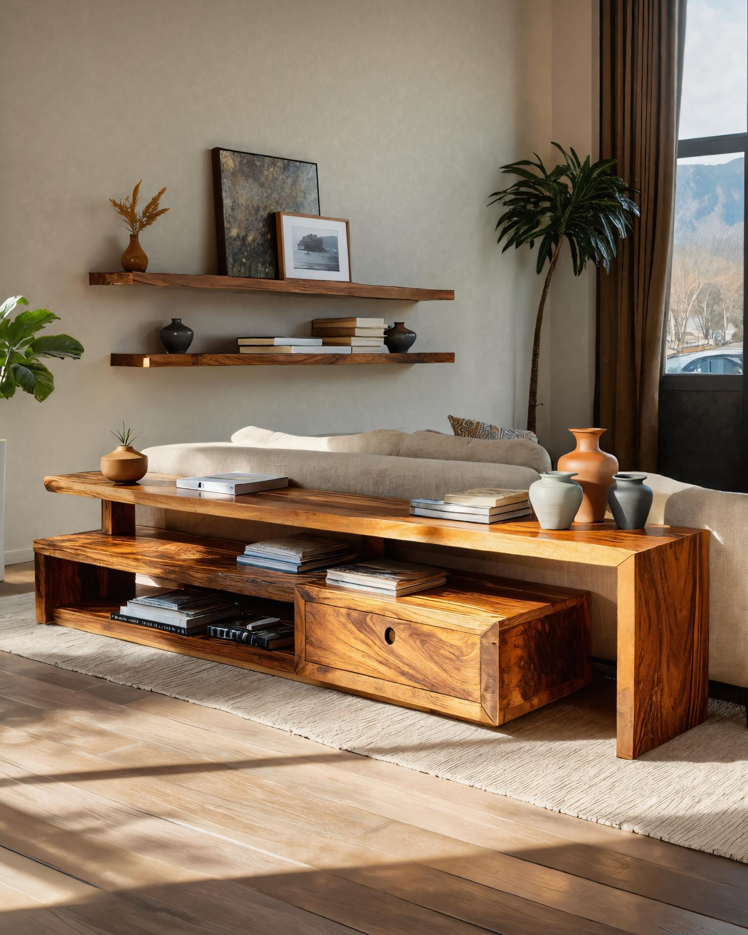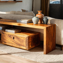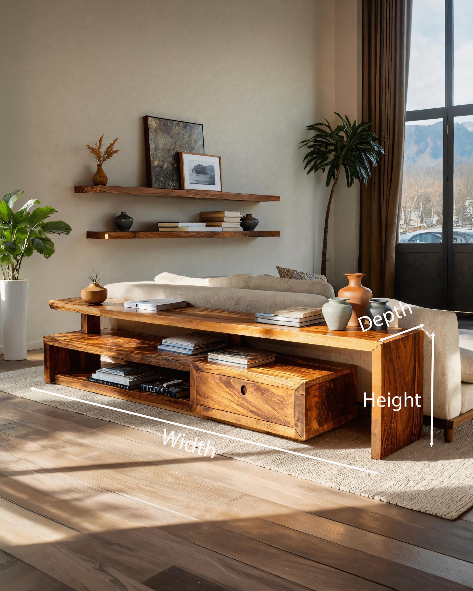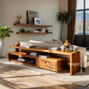 Designed to bring structure, warmth, and modern functionality into your home, the Contemporary Console Table With Drawers For Living Room features a clean solid-wood form with bold lines and beautifully expressive grain patterns. Its extended top and open shelving create generous display space, while the integrated drawers offer discreet storage for everyday items. This console table blends practicality with a refined contemporary aesthetic, making it a standout addition to any living room.