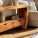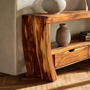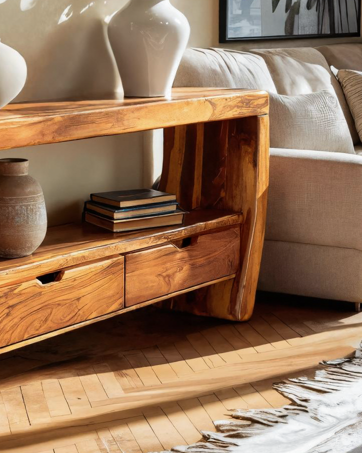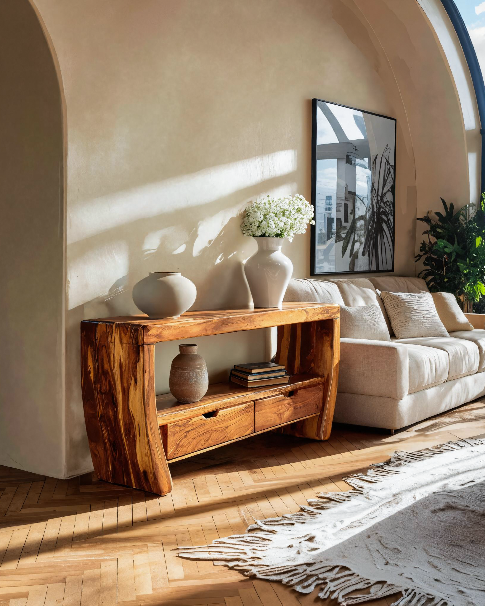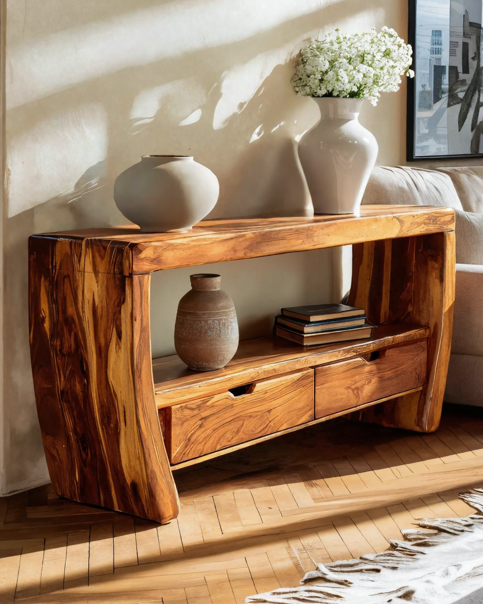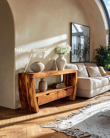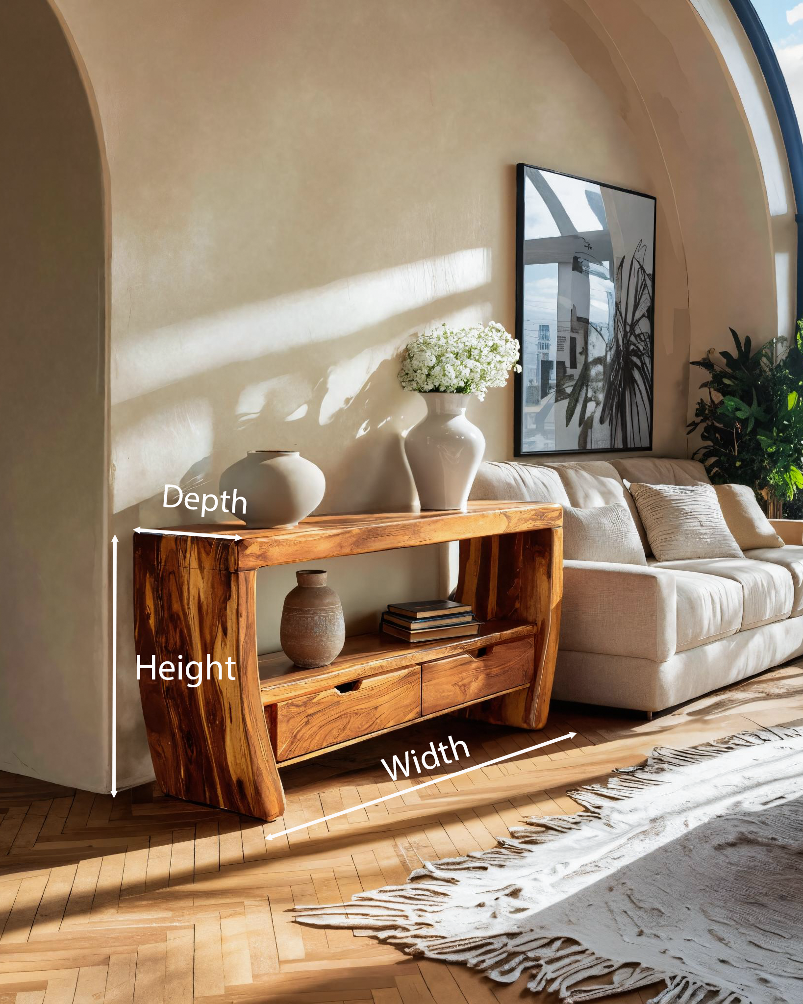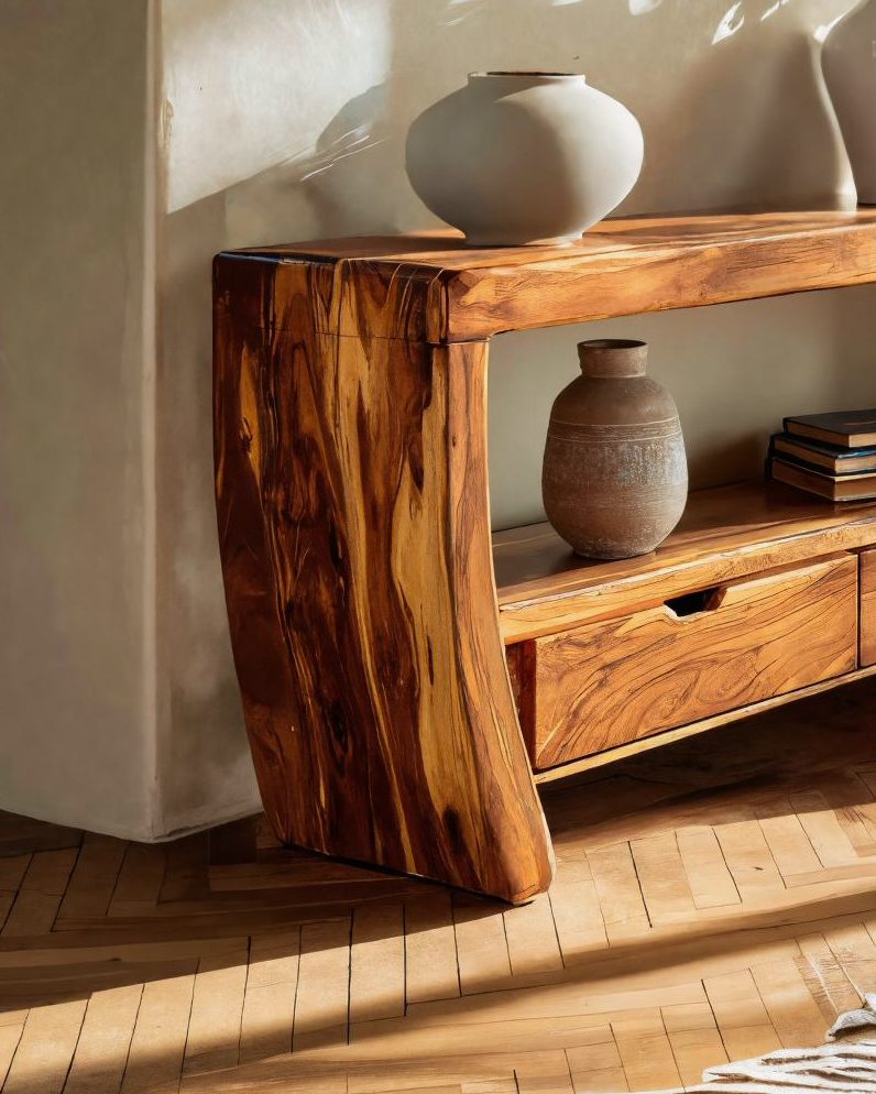 - Materials & Craftsmanship: Crafted from solid wood with hand-shaped surfaces that highlight expressive grain patterns and organic movement. Its curved and linear structure forms a balanced, grounded silhouette that feels cohesive in modern interiors.