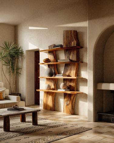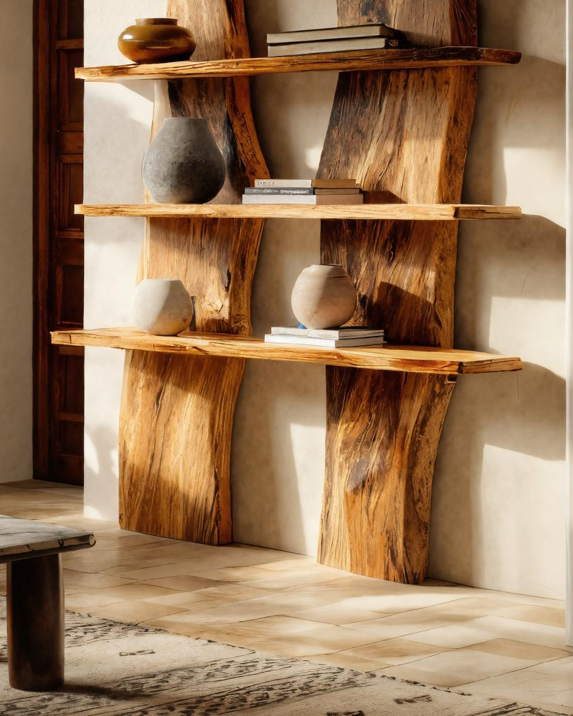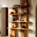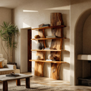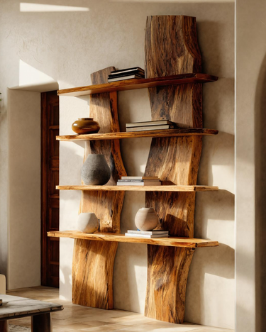 Merging contemporary design with organic artistry, the Modern Sculptural Floating Shelf Curved becomes an instant focal point in any living room. Its twin curved wooden panels rise with natural fluidity, each piece showcasing unique grain patterns and gentle asymmetry. Four wide floating shelves extend gracefully across the structure, creating a balanced composition ideal for displaying books, ceramics, and curated décor. With its warm tones and sculptural presence, this piece brings a refined yet earthy elegance to modern interiors, enhancing spaces that value both function and artistry.