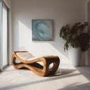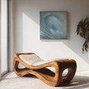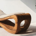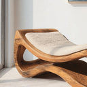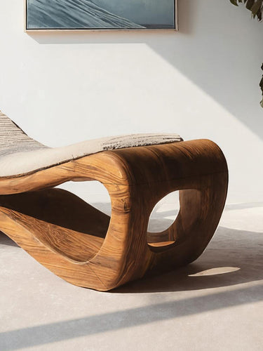 This lounger features a fluid wooden silhouette shaped with soft rises and curves that support a relaxed, reclined posture. The open cavities carved into the base add depth and visual lightness while showcasing the natural movement of the wood grain. A soft, textured cushion rests on top, offering contrast without overpowering the form.