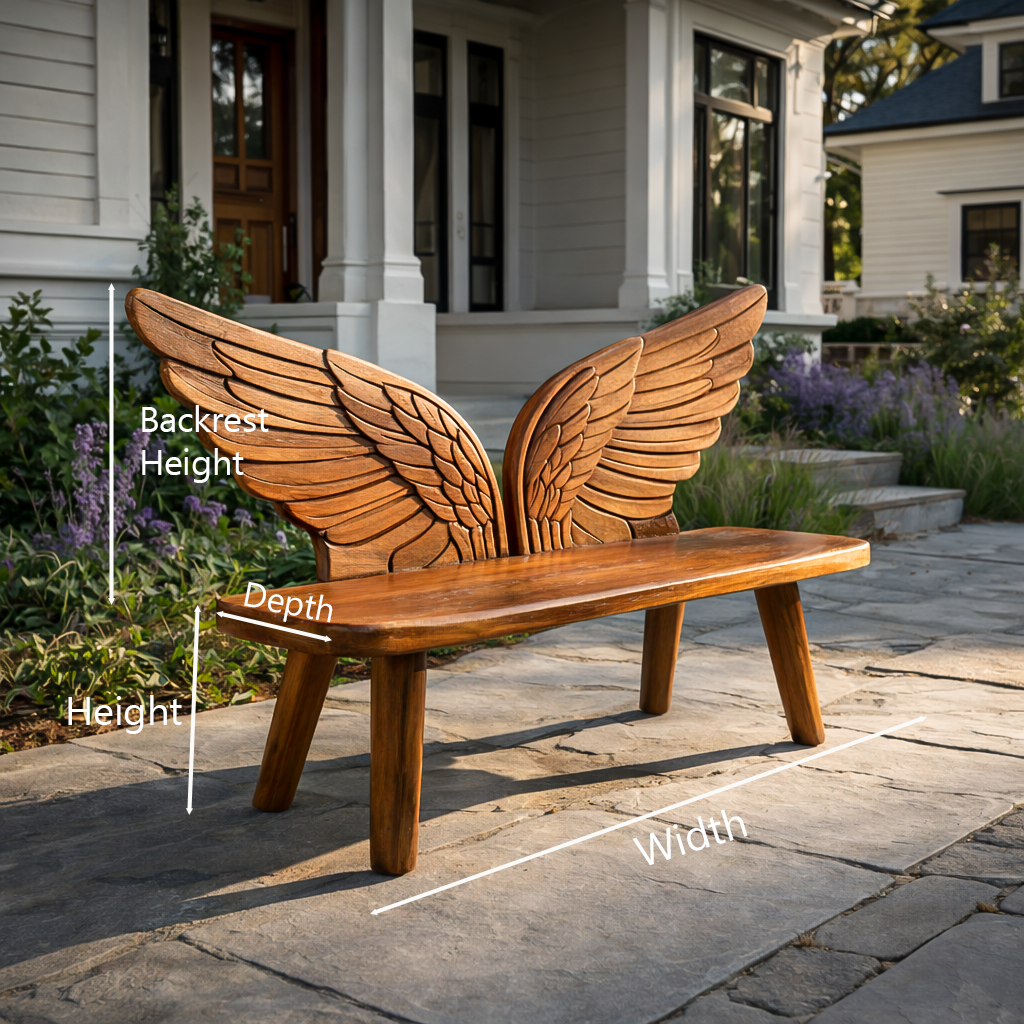 - Functional Benefits: The wide wooden seat offers comfortable space for everyday outdoor seating, while the carved wing backrest provides supportive positioning and a visually expressive design. Its stable leg structure keeps the bench balanced on stone, wood, or concrete surfaces, allowing it to function as both a resting place and a decorative highlight in outdoor areas.