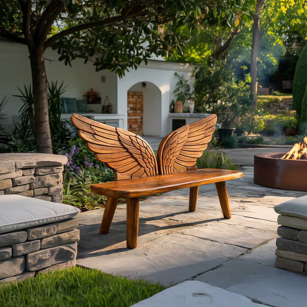 Graceful wing carved contours shape Outdoor Wood Bench Bird Wing Backrest For Patio, transforming a seating piece into a striking outdoor focal point. The sculpted backrest unfolds like a pair of wooden wings, with layered carved lines that highlight the natural grain and create depth across the surface. Set within a garden path, porch, or patio setting, the flowing form introduces warmth and visual movement while inviting moments of quiet rest outdoors.