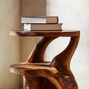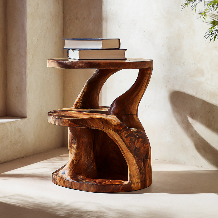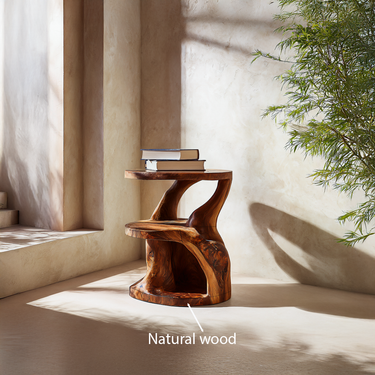 Gently stacked surfaces and fluid curves come together in the Contemporary Side Table Layered Design For Living Space, shaping a sculptural accent that feels grounded and intentional. The table features two rounded tiers connected by a continuous carved form, creating a smooth visual flow from top to base. Natural wood grain travels uninterrupted across each layer, revealing depth and movement that becomes more expressive under changing light. Its compact yet distinctive silhouette allows it to stand comfortably as a functional surface while adding quiet visual interest to the room.