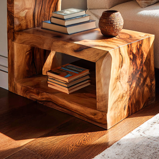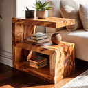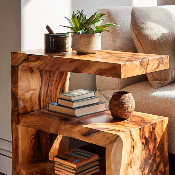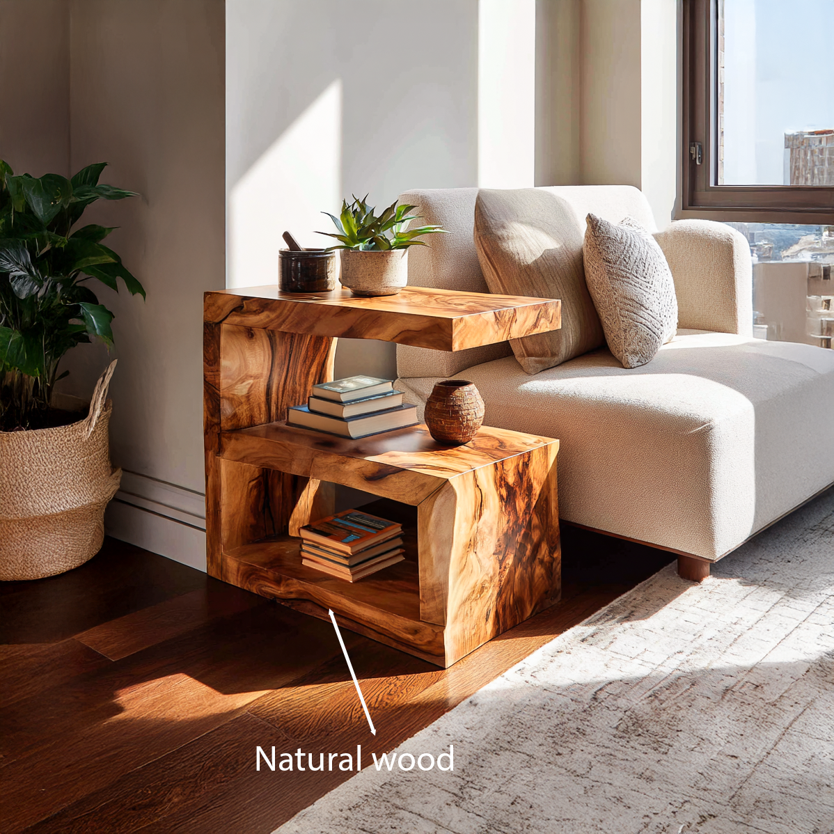 Compact layering and purposeful structure shape the Small Functional Side Table For Living Room Corner Or Sofa, presenting solid wood as a practical surface with added spatial depth. The table features a stepped, multi-level form that creates clear zones for placement and storage, allowing everyday items to be organized without clutter. Natural wood grain flows continuously across the top and through the recessed openings, bringing visual movement and warmth to the piece. Positioned beside a sofa or tucked neatly into a corner, it integrates naturally into the room while offering useful surface area.