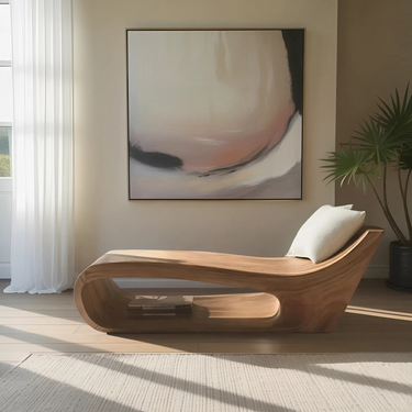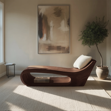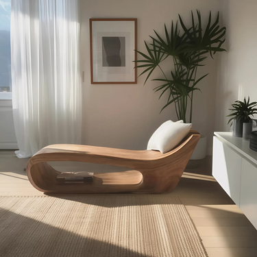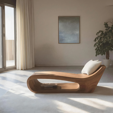 Fluid lines and low-slung proportions give Modern Lounge Chair For Living Room Or Bedroom a relaxed, sculptural presence that invites the body to settle naturally. The continuous solid wood form curves seamlessly from base to backrest, creating a flowing silhouette that sits close to the floor. Expressive wood grain follows the chair’s contours, adding visual movement while maintaining a grounded, restful character within the space.