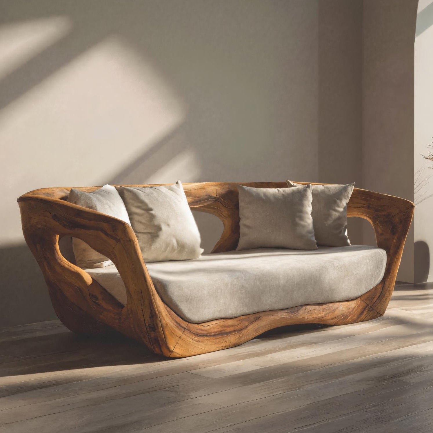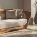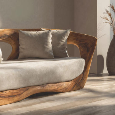 Shaped through continuous wood curves and grounded proportions, Modern Sculpted Sofa For Living Room Decor presents a low, embracing seating form defined by flowing lines and visible natural grain. The sculpted wooden frame wraps gently around the seat, creating an enclosed silhouette that feels substantial yet visually open. Soft upholstered cushions sit within the carved structure, balancing the organic wood presence with a calm, inviting surface for everyday use.