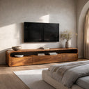 Flowing wood contours shape the Modern Organic TV Console For Living Room, where a continuous sculpted frame forms both the outer silhouette and the open display shelf beneath the television. The console’s smooth curves allow the natural grain to move seamlessly across the surface, creating a sense of quiet motion within the wood. Its elongated form anchors the wall while providing a warm platform for décor, books, and everyday media essentials.