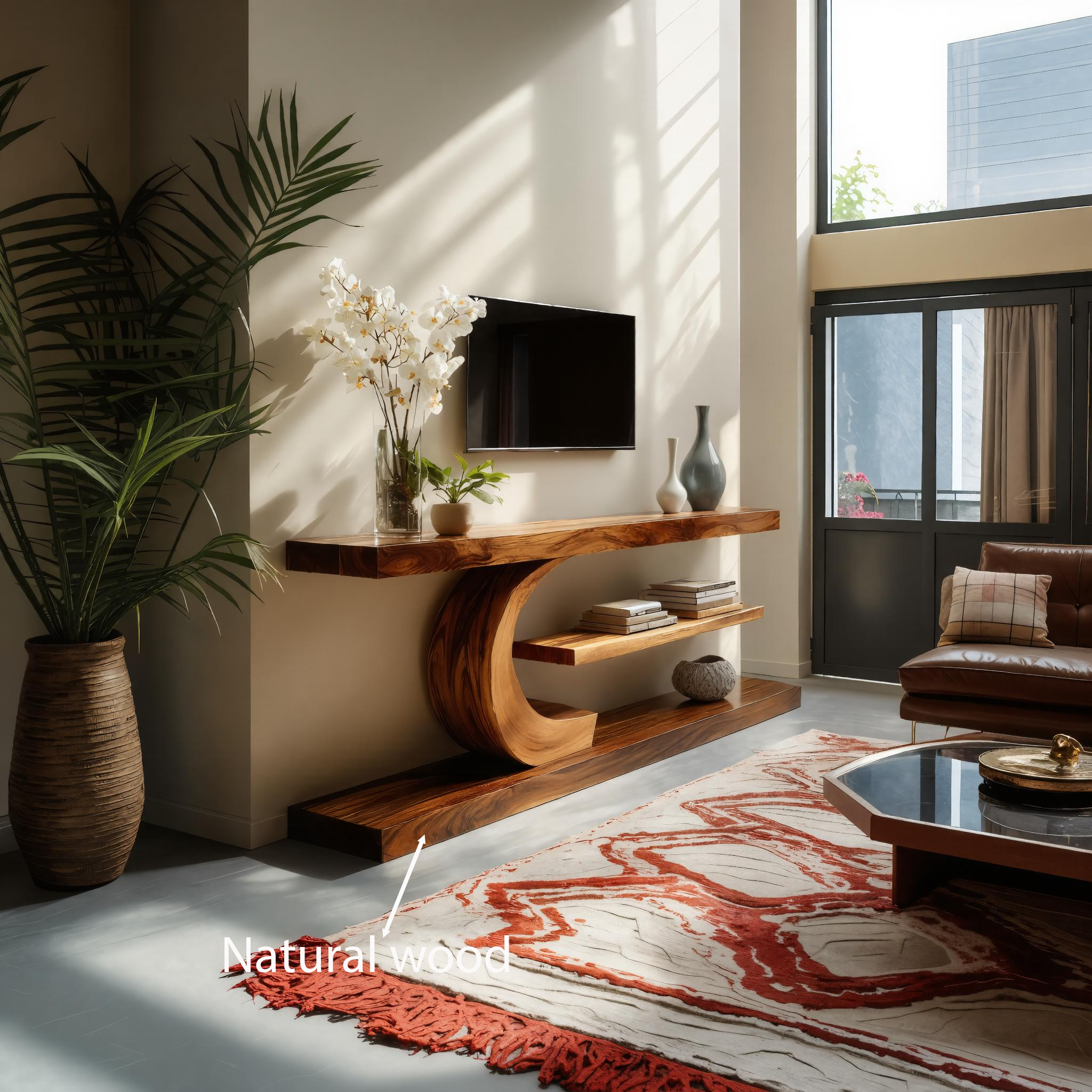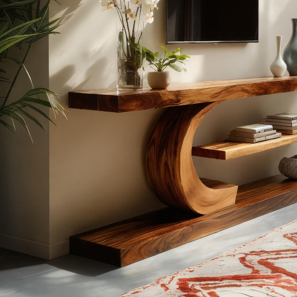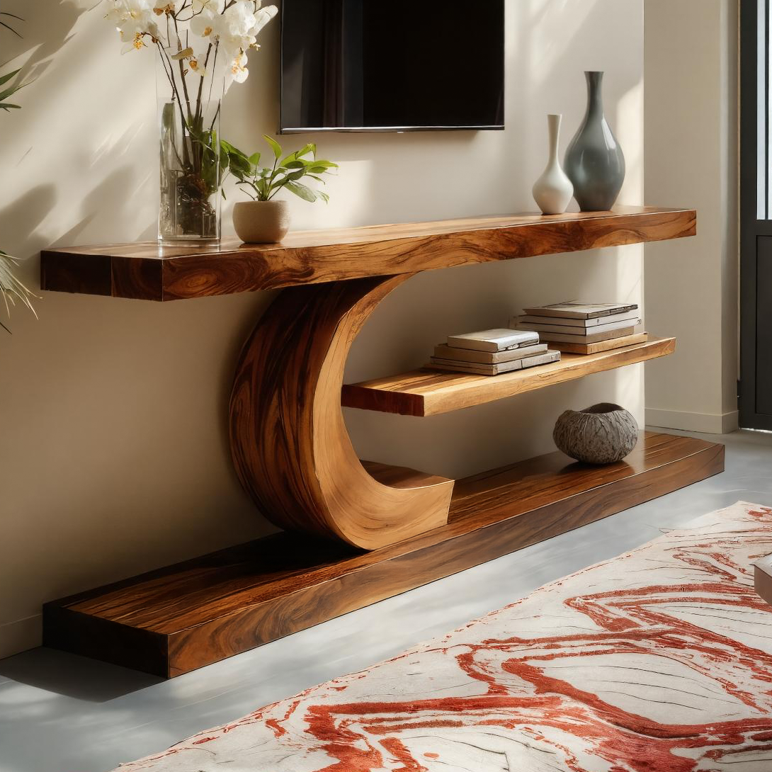 - Materials & Craftsmanship: Made from solid wood with expressive grain patterns, the console is shaped with smooth hand-finished edges and a curved support structure that gives the design a distinctive sense of movement.